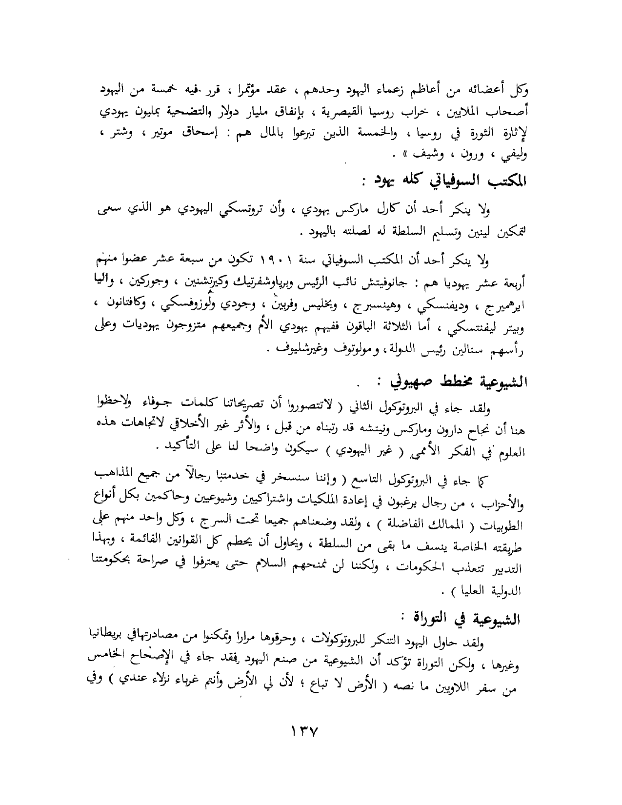 وكل أعضائه من أعاظم زعماء اليهود وحدهم، عقد مؤتمرًا، قرر فيه خمسة من اليهود أصحاب الملايين، خراب روسيا القيصرية، بإنفاق مليار دولار والتضحية بمليون يهودي لإثارة الثورة في روسيا، والخمسة الذين تبرعوا بالمال هم: (إسحاق موتير)، و (شتر)، و (ليفي)، و (رون)، و (شيف)».