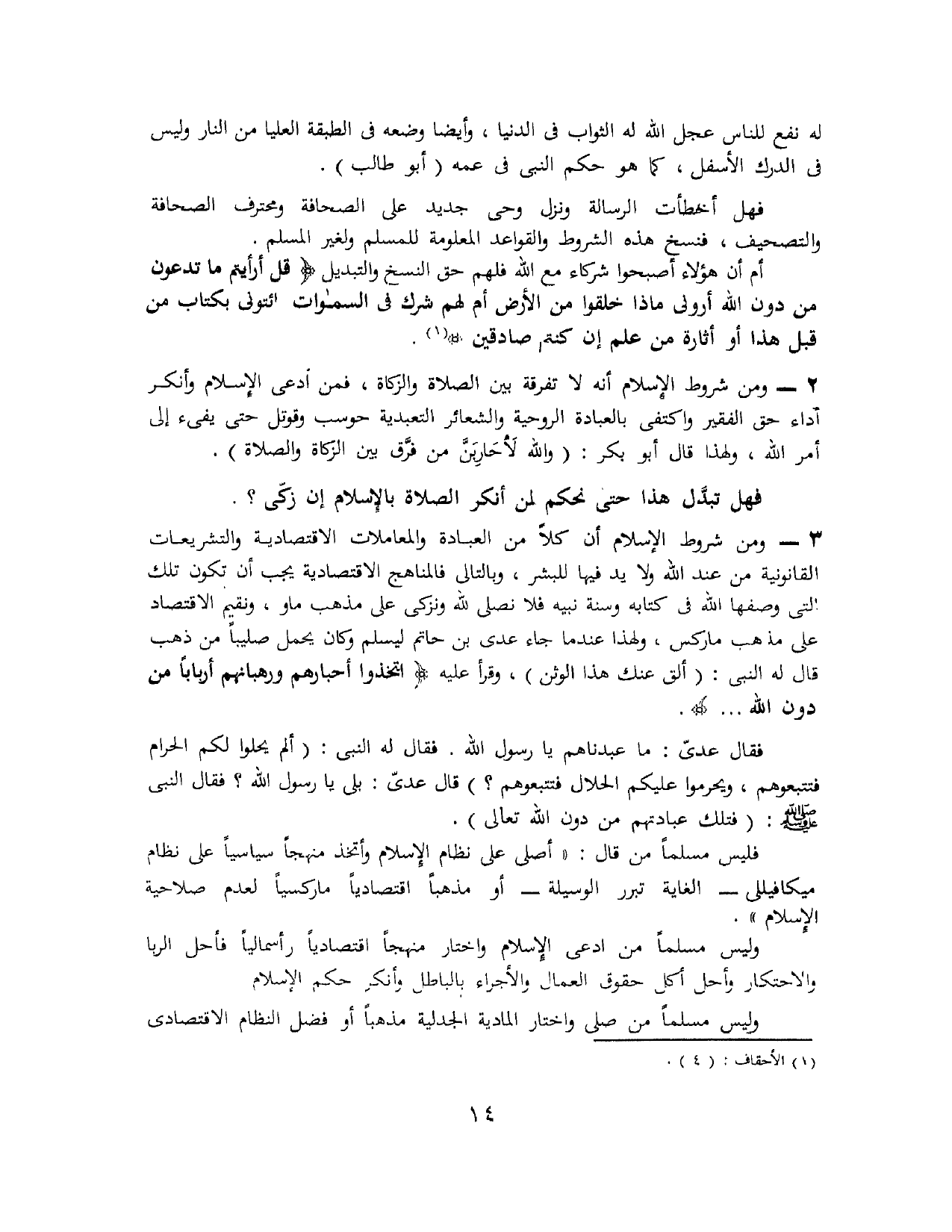 3 - ومن شروط الإسلام أن كُلاًّ من العبادة والمعاملات الاقتصادية والتشريعات القانونية من عند الله ولا يد فيها للبشر، وبالتالي فالمناهج الاقتصادية يجب أن تكون تلك التي وصفها اللهُ في كتابه وسنة نبيه فلا نصلي للهِ ونزكي على مذهب (مَاوْ)، ونقيم الاقتصاد على مذهب (ماركس)، ولهذا عندما جاء عدي بن حاتم ليسلم وكان يحمل صليبًا من ذهب قال له النبي - صَلَّى اللهُ عَلَيْهِ وَسَلَّمَ -: «أَلْقِ عَنْكَ هَذَا الوَثَنَ» وَقَرَأَ عَلَيْهِ: {اتَّخَذُوا أَحْبَارَهُمْ وَرُهْبَانَهُمْ أَرْبَابًا مِنْ دُونِ اللَّهِ} [التوبة: 31]، فَقَالَ عَدِيٌّ: «مَا عَبَدْنَاهُمْ يَا رَسُولَ اللهِ». فَقَالَ لَهُ النَّبِيُّ - صَلَّى اللهُ عَلَيْهِ وَسَلَّمَ -: «أَلَمْ يُحِلُّوا لَكُمْ الحَرَامَ فَتَتَّبِعُوهُمْ، وَيَحَرِّمُوا عَلَيْكُمْ الحَلالَ فَتَتَّبِعُوهُمْ؟». قَالَ عَدِّيٌّ: «بَلَى يَا رَسُولَ اللهِ»، قَالَ النَّبِيُّ - صَلَّى اللهُ عَلَيْهِ وَسَلَّمَ -: «فَتِلْكَ عِبَادَتَهُمْ مِنْ دُونَ اللهِ تَعَالَى» (*).