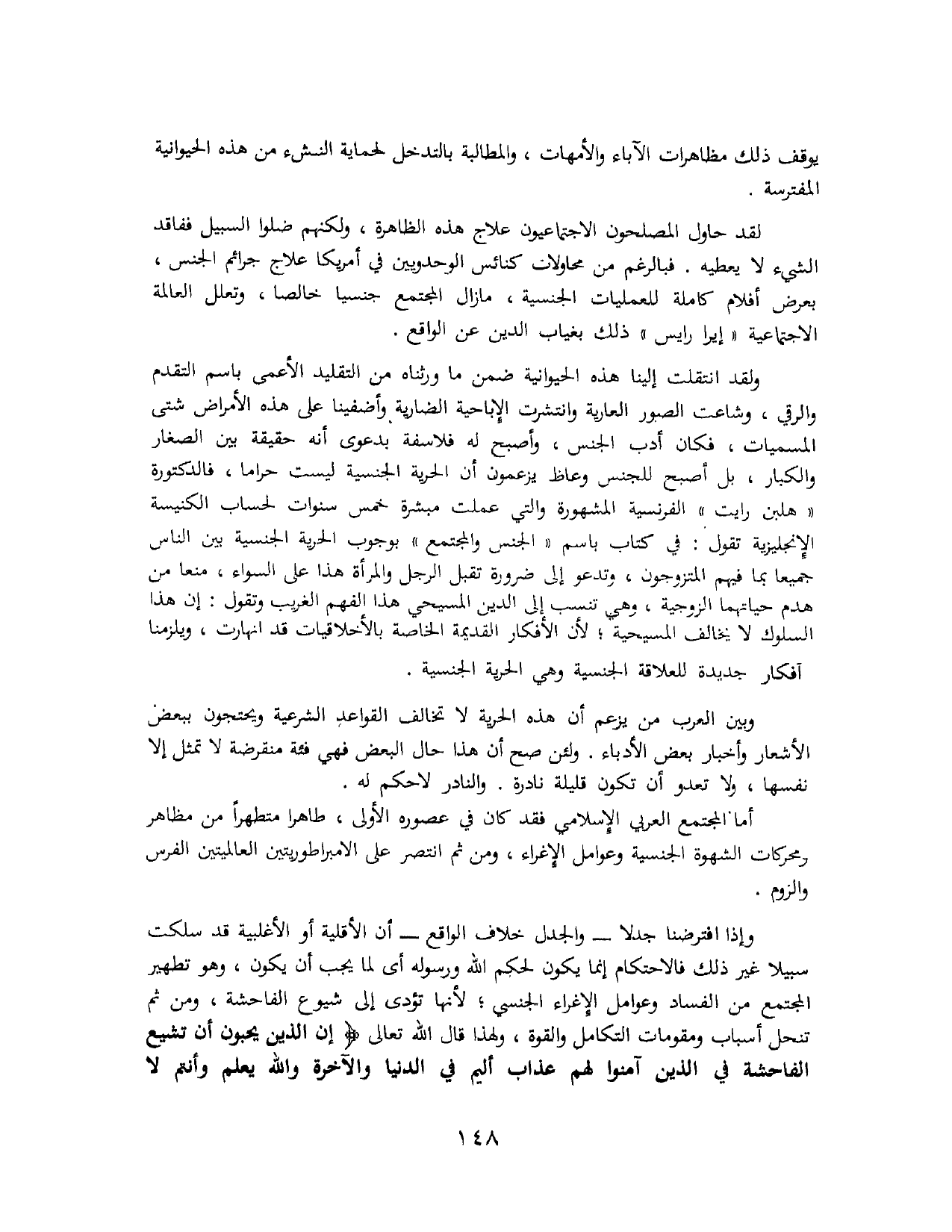 ولقد انتقلت إلينا هذه الحيوانية ضمن ما ورثناه من التقليد الأعمى باسم التقدم والرقي، وشاعت الصدور العارية وانتشرت الإباحية الضارية وأضفينا على هذه الأمراض شتى المسميات، فكان أدب الجنس، وأصبح له فلاسفة بدعوى أنه حقيقة بين الصغار والكبار، بل أصبح للجنس وعاظ يزعمون أن الحرية الجنسية ليست حرامًا، فالدكتورة (هلين رايت) الفرنسية المشهورة والتي عملت مبشرة خمس سنوات لحساب الكنيسة الإنجليزية تقول في كتاب باسم " الجنس والمجتمع " بوجوب الحرية الجنسية بين الناس جميعًا بما فيهم المتزوجون، وتدعو إلى ضرورة تقبل الرجل والمرأة هذا على السواء، منعًا من هدم حياتهما الزوجية، وهي تنسب إلى الدين المسيحي هذا الفهم الغريب وتقول: «إن هذا السلوك لا يخالف المسيحية، لأن الأفكار القديمة الخاصة بالأخلاقيات قد انهارت، ويلزمنا أفكار جديدة للعلاقة الجنسية وهي الحرية الجنسية».