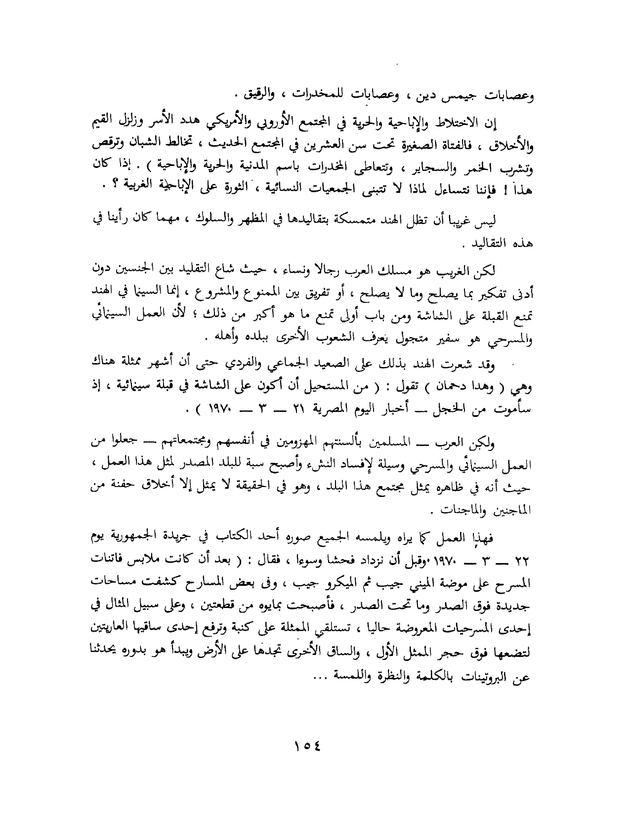 لكن الغريب هو مسلك العرب رجالاً ونساءً، حيث شاع التقليد بين الجنسين دون أدنى تفكير بما يصلح وما لا يصلح، أو تفريق بين الممنوع والمشروع، إنما السينما في الهند تمنع القبلة على الشاشة ومن باب أولى تمنع ما هو أكبر من ذلك، لأن العمل السينمائي والمسرحي هو سفير متجول يعرف الشعوب الأخرى ببلده وأهله.