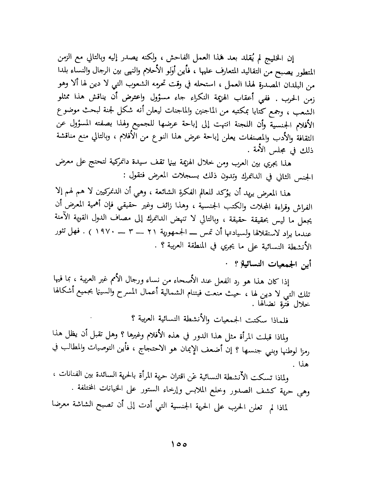 إن الخليج لم يقلد بعد هذا العمل الفاحش، ولكنه يصدر إليه وبالتالي مع الزمن المتطور يصبح من التقاليد المتعارف عليها، فأين أولو الأحلام والنهى بين الرجال والنساء بلدًا من البلدان المصدرة لهذا العمل، استحله في وقت تحرمه الشعوب التي لا دين لها ألا وهو زمن الحرب. ففي أعقاب الهزيمة النكراء جاء مسؤول واعترض أن يناقش هذا ممثلو الشعب، وجمع كُتَّابًا بمكتبه من الماجنين والماجنات ليعلن أنه شكل لجنة لبحث موضوع الأفلام الجنسية وأن اللجنة انتهت إلى إباحة عرضها للجميع ولهذا بصفته المسؤول عن الثقافة والأدب والمصنفات يعلن إباحة عرض هذا النوع من الأفلام، وبالتالي منع مناقشة ذلك في مجلس الأمة.