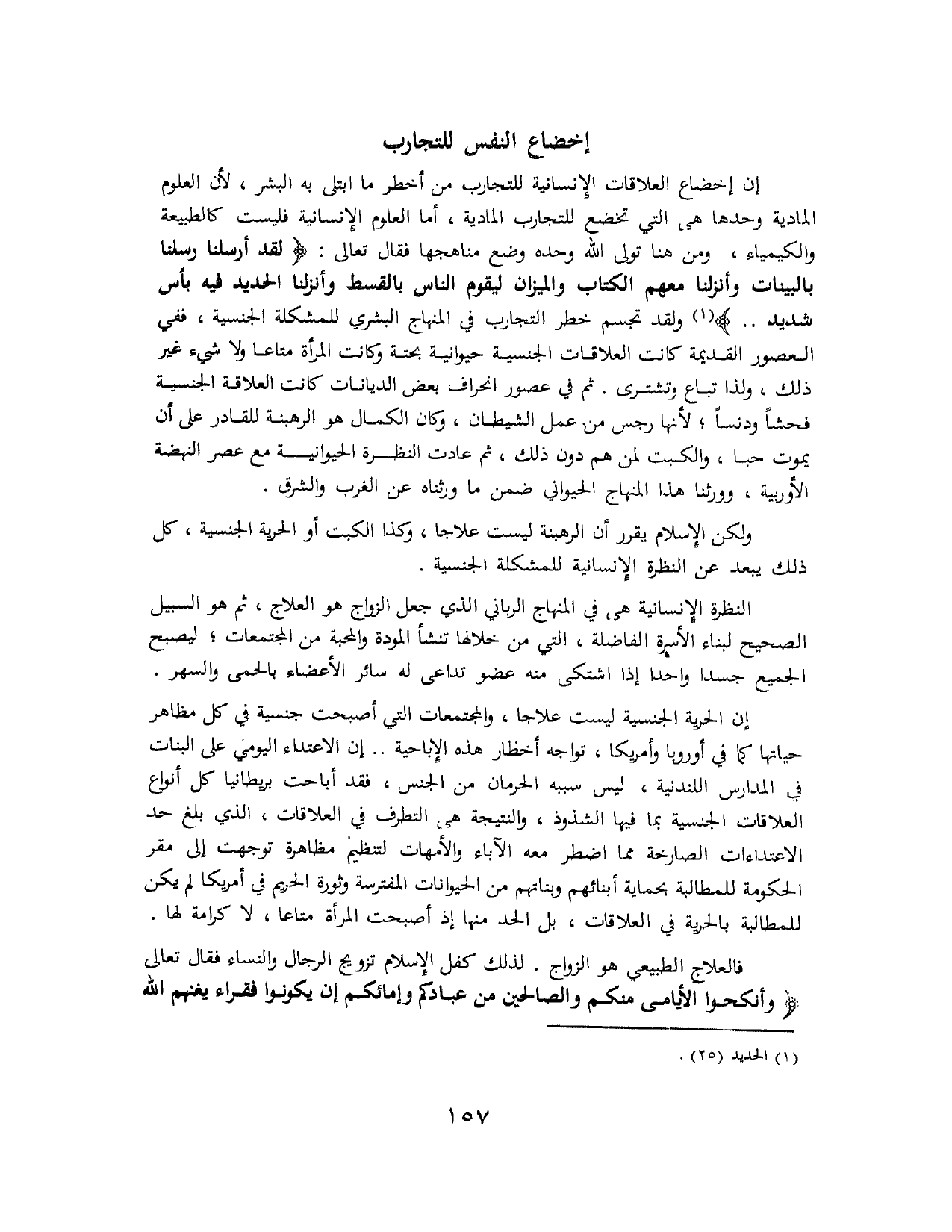 إن إخضاع العلاقات الإنسانية للتجارب من أخطر ما ابتلي به البشر، لأن العلوم المادية وحدها هي التي تخضع للتجارب المادية، أما العلوم الإنسانية فليست كالطبيعة والكيمياء، ومن هنا تولى الله وحده وضع مناهجها فقال تعالى: {لَقَدْ أَرْسَلْنَا رُسُلَنَا بِالْبَيِّنَاتِ وَأَنْزَلْنَا مَعَهُمُ الْكِتَابَ وَالْمِيزَانَ لِيَقُومَ النَّاسُ بِالْقِسْطِ وَأَنْزَلْنَا الْحَدِيدَ فِيهِ بَأْسٌ شَدِيدٌ} (¬1). ولقد تجسم خطر التجارب في المنهاج البشري للمشكلة الجنسية، ففي العصور القديمة كانت العلاقات الجنسية حيوانية بحتة وكانت المرأة متاعًا ولا شيء غير ذلك، ولذا تباع وتشترى. ثم في عصور انحراف بعض الديانات كانت العلاقة الجنسية فحشًا ودنسًا، لأنها رجس من عمل الشيطان، وكان الكمال هو الرهبنة للقادر على أن يموت حبًا، والكبت لمن هم دون ذلك، ثم عادت النظرة الحيوانية مع عصر النضهة الأوروبية، وورثنا هذا المنهاج الحيواني ضمن ما ورثناه عن الغرب والشرق.