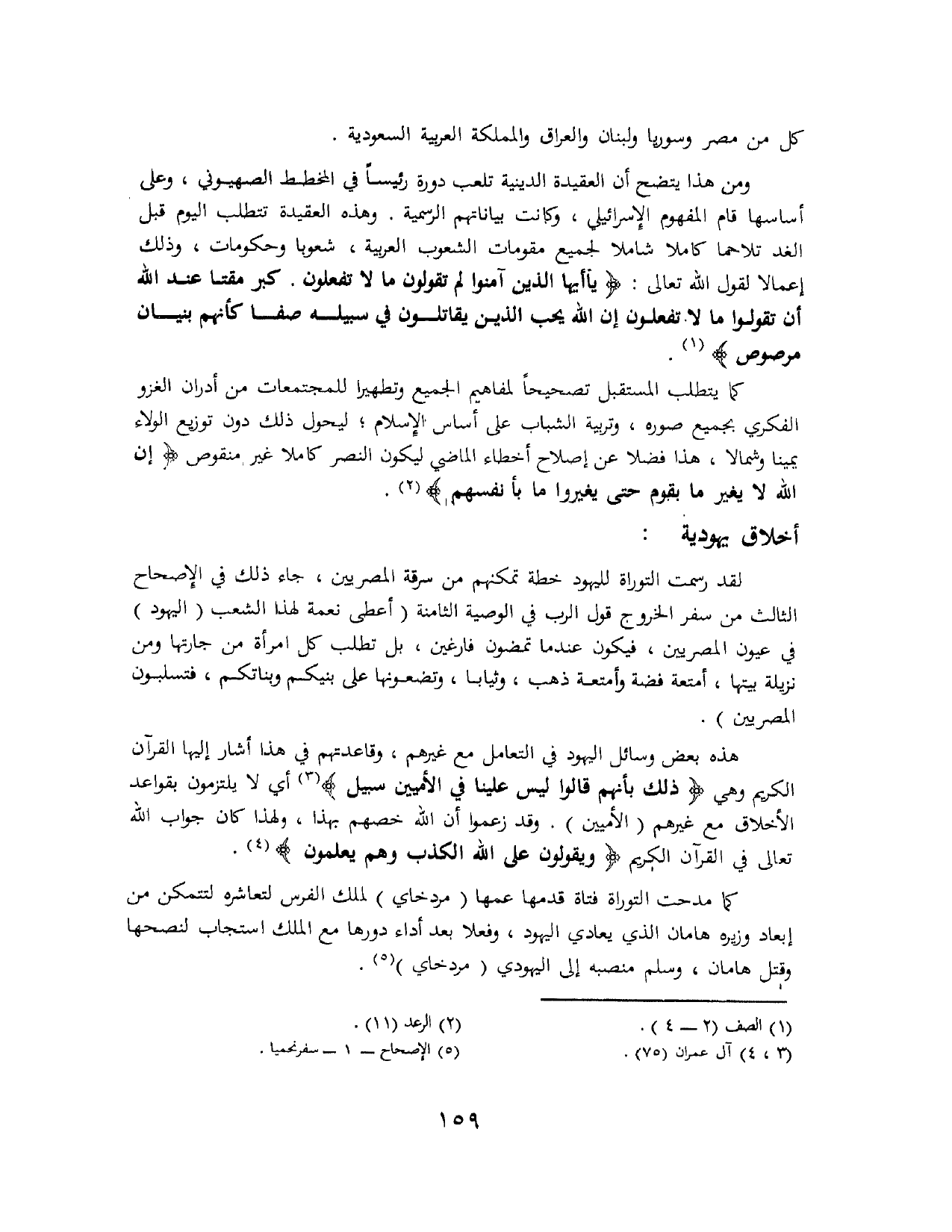 ومن هذا يتضح أن العقيدة الدينية تلعب دورة رئيسًا في المخطط الصهيوني، وعلى أساسها قام المفهوم الإسرائيلي، وكانت بياناتهم الرسمية. وهذه العقيدة تتطلب اليوم قبل الغد تلاحمًا كاملاً شاملاً لجميع مقومات الشعوب العربية، شعوبًا وحكومات، وذلك إعمالاً لقول الله تعالى: {يَا أَيُّهَا الَّذِينَ آمَنُوا لِمَ تَقُولُونَ مَا لَا تَفْعَلُونَ، كَبُرَ مَقْتًا عِنْدَ اللَّهِ أَنْ تَقُولُوا مَا لَا تَفْعَلُونَ، إِنَّ اللَّهَ يُحِبُّ الَّذِينَ يُقَاتِلُونَ فِي سَبِيلِهِ صَفًّا كَأَنَّهُمْ بُنْيَانٌ مَرْصُوصٌ} (¬1).