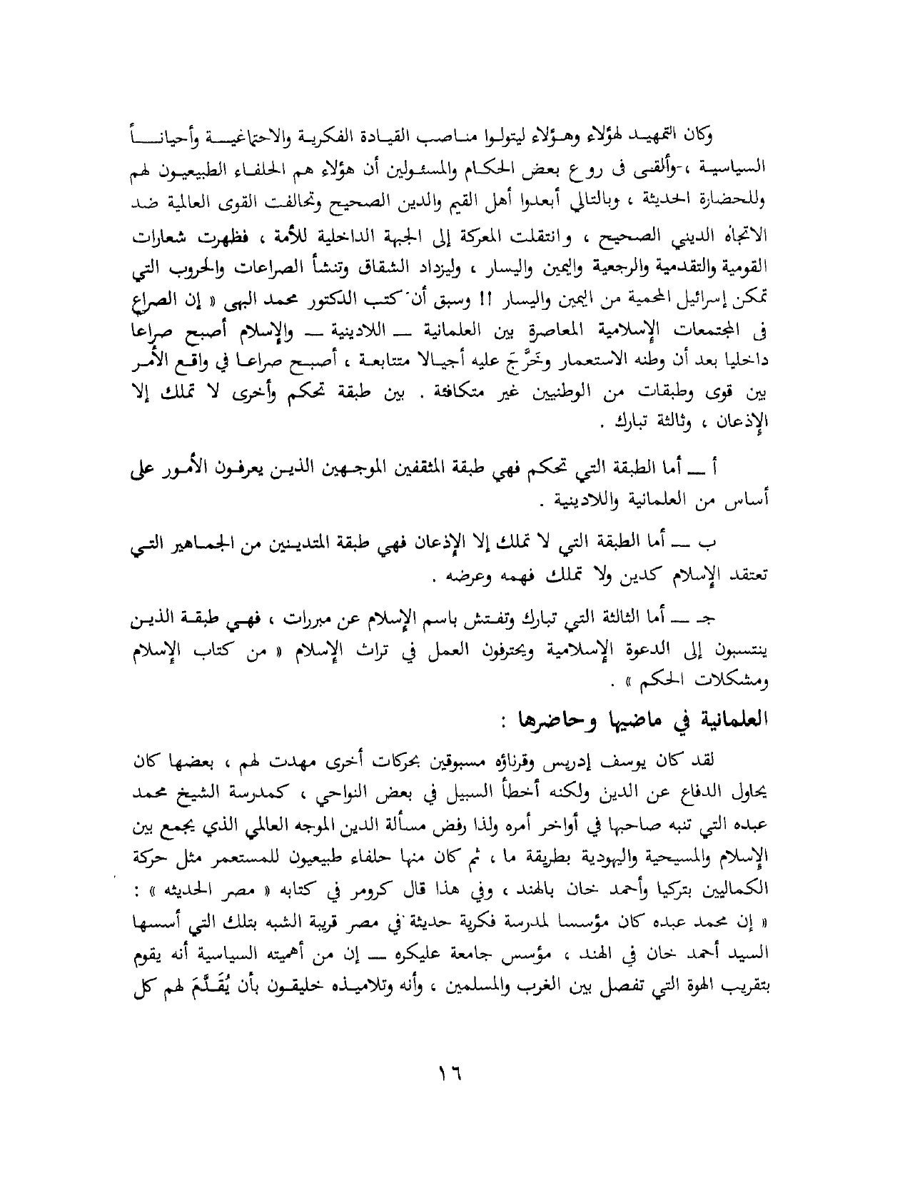 ج - أَمَّا الثَّالِثَةُ التِي تُبَارِكُ وَتُفَتِّشُ بِاسْمِ الإِسْلاَمِ عَنْ مُبَرِّرَاتٍ، فَهِيَ طَبَقَةُ الذِينَ يَنْتَسِبُونَ إِلَى الدَّعْوَةِ الإِسْلاَمِيَّةِ وَيَحْتَرِفُونَ العَمَلَ فِي تُرَاثِ الإِسْلاَمِ». (من كتاب " الإسلام ومشكلات الحكم ").