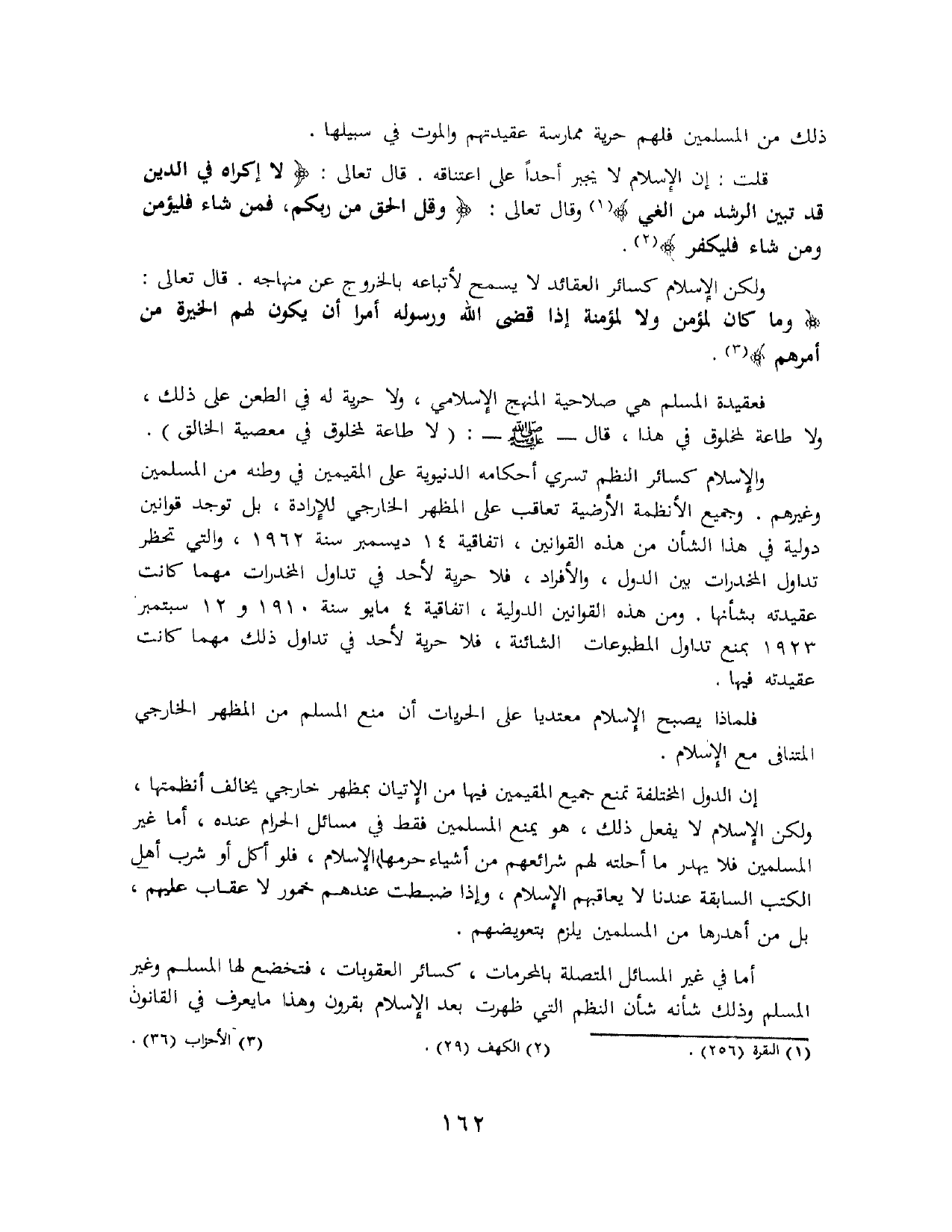 والإسلام كسائر النظم تسري أحكامه الدنيوية على المقيمين في وطنه من المسلمين وغيرهم. وجميع الأنظمة الأرضية تعاقب على المظهر الخارجي للإرادة، بل توجد قوانين دولية في هذا الشأن من هذه القوانين، اتفاقية 14 ديسمبر 1962، والتي تحظر تداول المخدرات بين الدول، والأفراد، فلا حرية لأحد في تداول المخدرات مهما كانت عقيدته بشأنها. ومن هذه القوانين الدولية، اتفاقية 4 مايو سنة 1910 و 12 سبتمبر 1923 بمنع تداول المطبوعات الشائنة، فلا حرية لأحد في تداول ذلك مهما كانت عقيدته فيها.