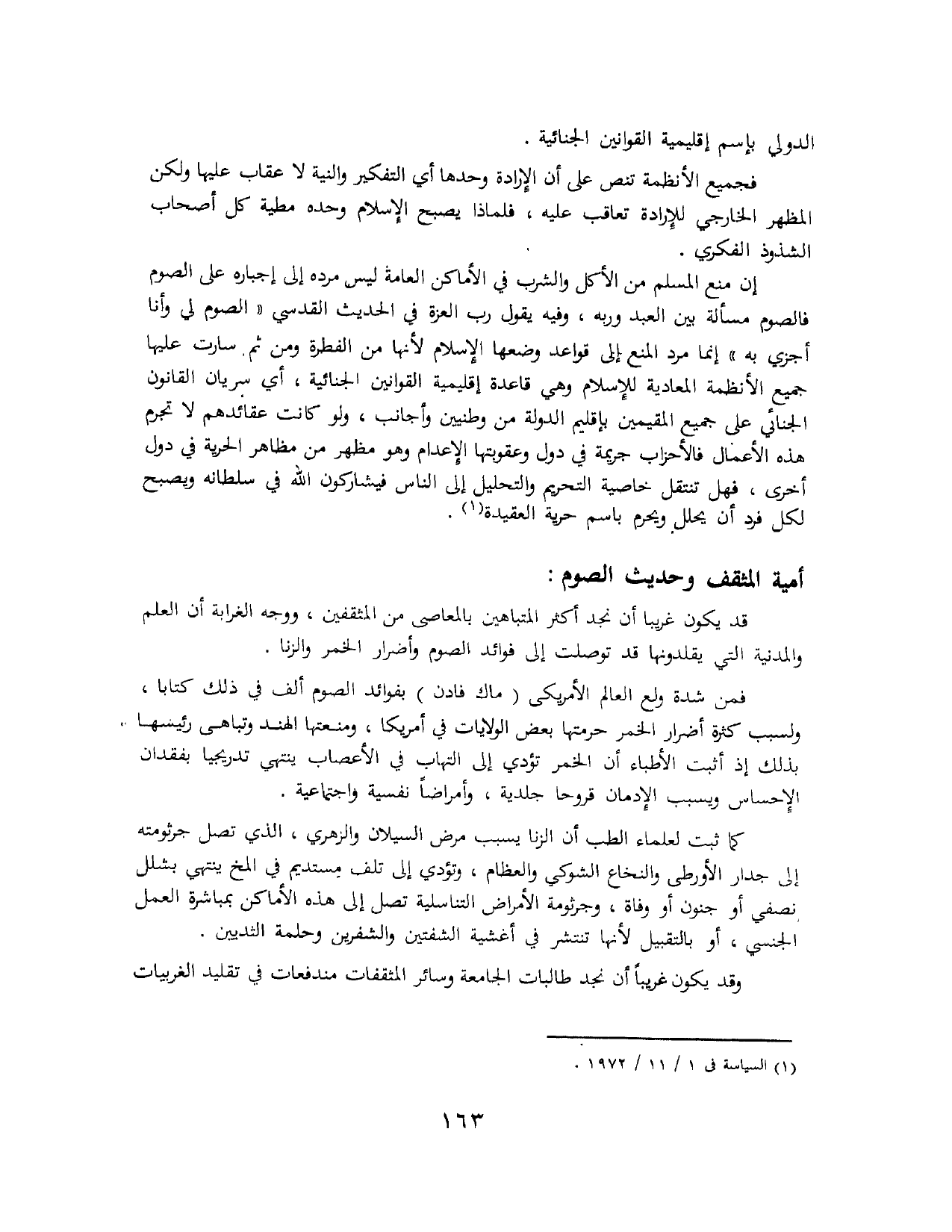 إن منع المسلم من الأكل والشرب في الأماكن العامة ليس مرده إلى إجباره على الصوم فالصوم مسألة بين العبد وربه، وفيه يقول رب العزة في الحديث القدسي: «الصَّوْمُ لِي وَأَنَا أَجْزِي بِهِ». إنما مرد المنع إلى قواعد وضعها الإسلام لأنها من الفطرة ومن ثم سارت عليها جميع الأنظمة المعادية للإسلام وهي قاعدة إقليمية القوانين الجنائية، أي سريان القانون الجنائي على جميع المقيمين بإقليم الدولة من وطنيين وأجانب، ولو كانت عقائدهم لا تجرم هذه الأعمال فالأحزاب جريمة في دول وعقوبتها الإعدام وهو مظهر من مظاهر الحرية في دول أخرى، فهل تنتقل خاصية التحريم والتحليل إلى الناس فيشاركون الله في سلطانه ويصبح لكل فرد أن يحلل ويحرم باسم حرية العقيدة (¬1).