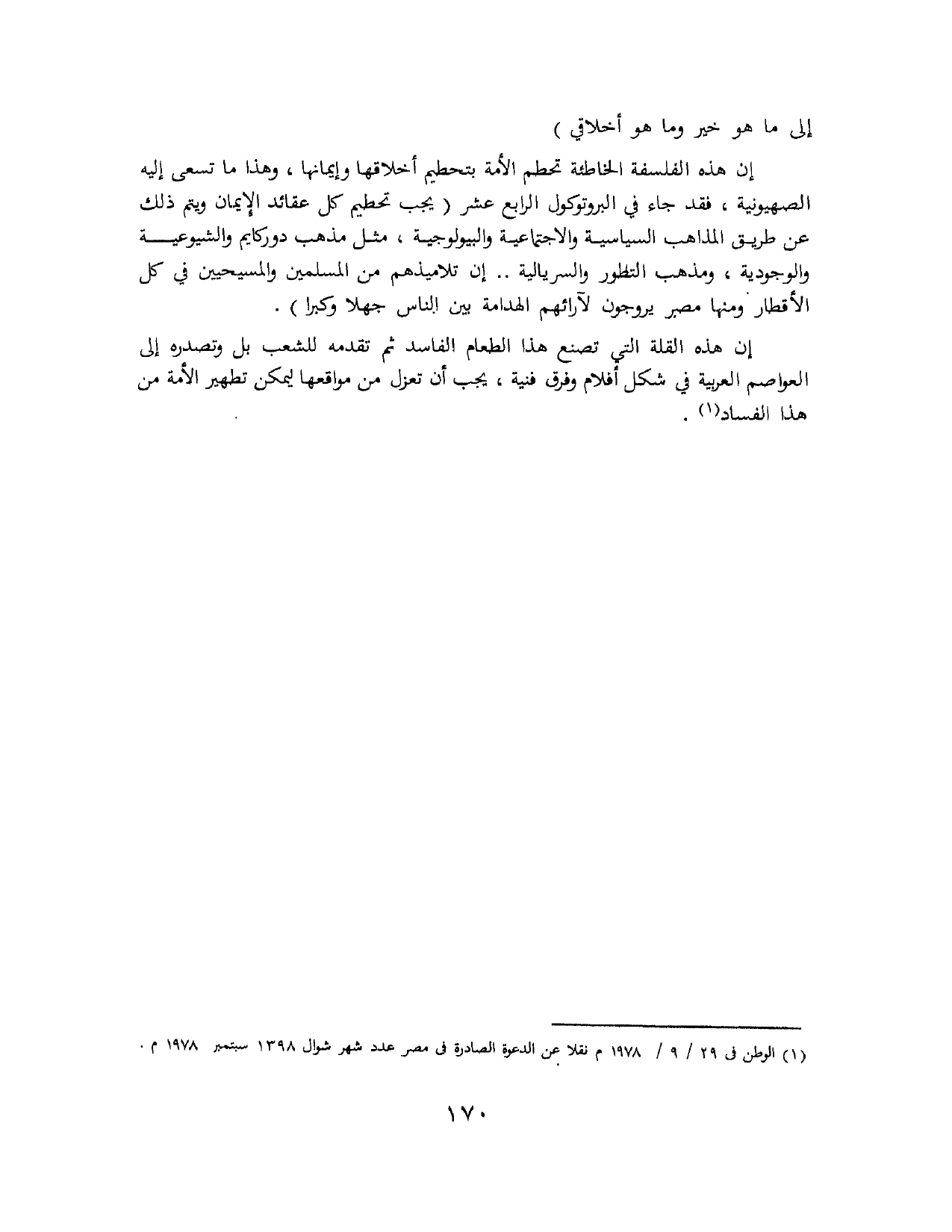 (¬1) " الوطن " في 29/ 9 / 1978 م نقلاً عن " الدعوة " الصادرة في مصر عدد شهر شوال 1398 هـ - سبتمبر 1978 م.