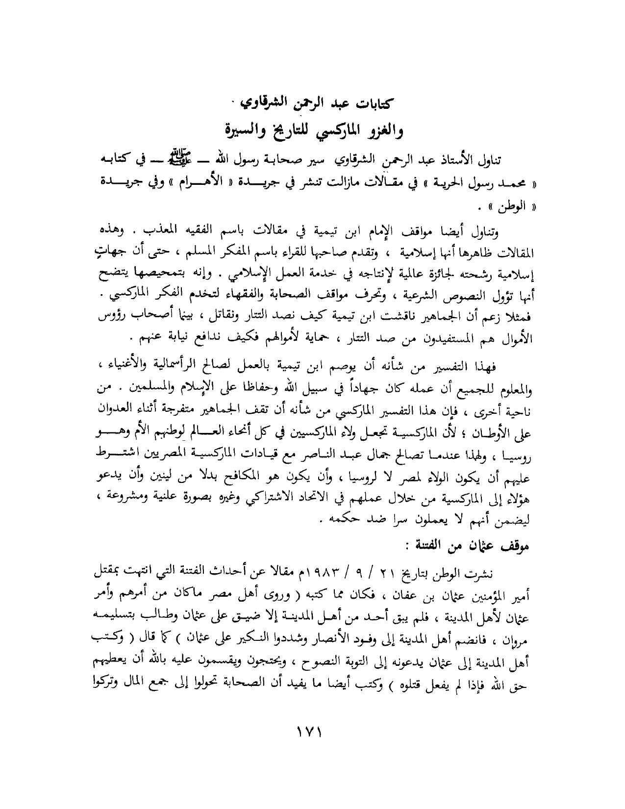 كِتَابَاتُ عَبْدِ الرَّحْمَنِ الشَّرْقَاوِي وَالغَزْوِ المَارْكْسِيِّ لِلْتَّارِيخِ وَالسِّيرَةِ: