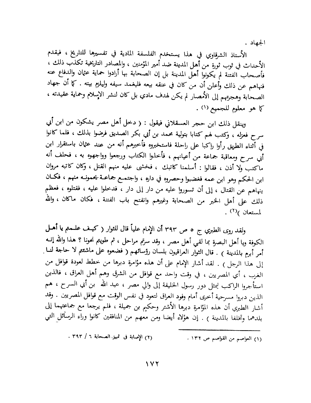 والأستاذ الشرقاوي في هذا يستخدم الفلسفة المادية في تفسيرها للتاريخ، فيقدم الأحداث في ثوب ثورة من أهل المدينة ضد أمير المؤمنين، والمصادر التاريخية تكذب ذلك، فأصحاب الفتنة لم يكونوا أهل المدينة بل إن الصحابة بها أرادوا حماية عثمان والدفاع عنه فنهاهم عن ذلك وأعلن أن من كان في عنقه بيعة فليغمد سيفه وليلزم بيته. كما أن جهاد الصحابة وهجرتهم إلى الأمصار لم يكن لهدف مادي بل كان لنشر الإسلام وحماية عقيدته، كما هو معلوم للجميع (¬1).