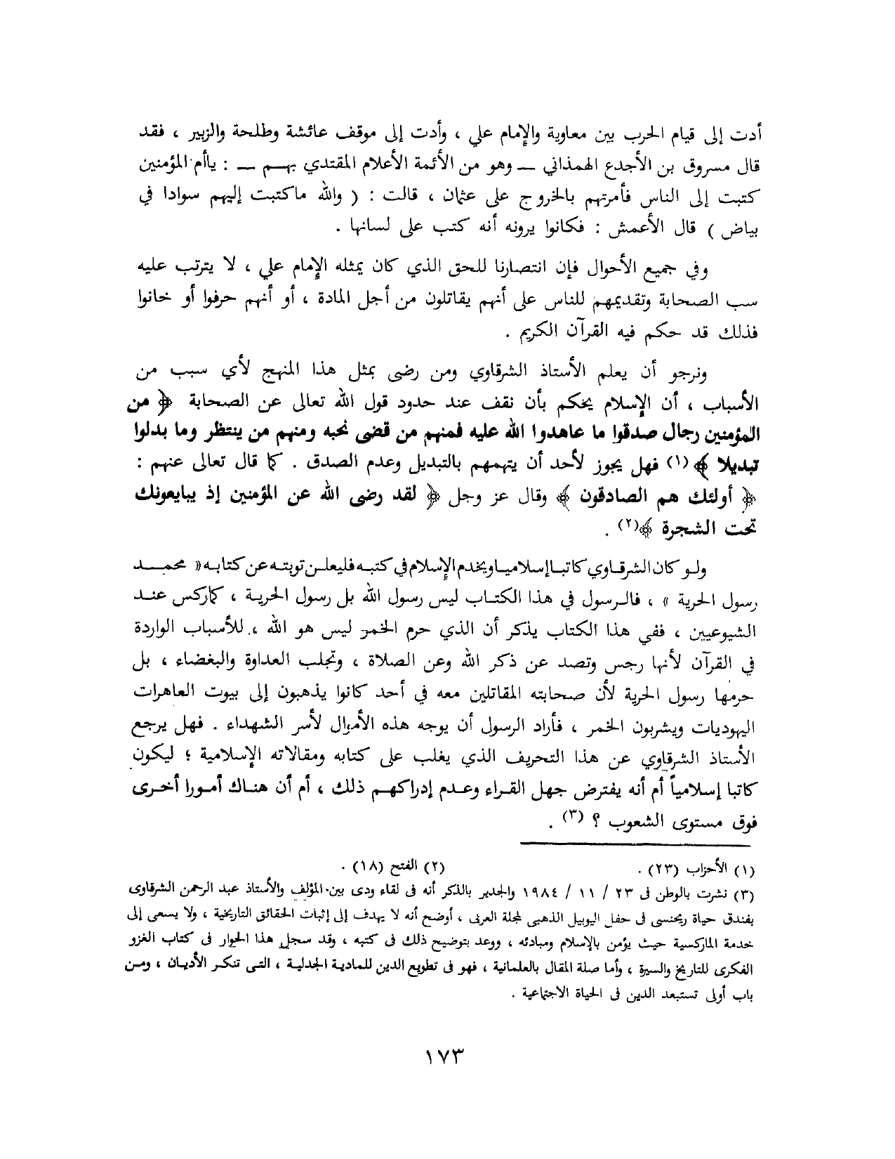 (¬3) نشرت بـ " الوطن " في 23/ 11 / 1984 والجدير بالذكر أنه في لقاء ودي بين المؤلف والأستاذ عبد الرحمن الشرقاوي بفندق " حياة ريجنسي " في حفل اليوبيل الذهبي لمجلة " العربي "، أوضح أنه لا يهدف إلى إثبات الحقائق التاريخية، ولا يسعى إلى خدمة الماركسية حيث يؤمن بالإسلام ومبادئه، ووعد بتوضيح ذلك في كتبه، وقد سجل هذا الحوار في كتاب " الغزو الفكري للتاريخ والسيرة "، وأما صلة المقال بالعلمانية، فهو في تطويع الدين للمادية الجدلية، التي تنكر الأديان، ومن باب أولى تستبعد الدين في الحياة الاجتماعية.