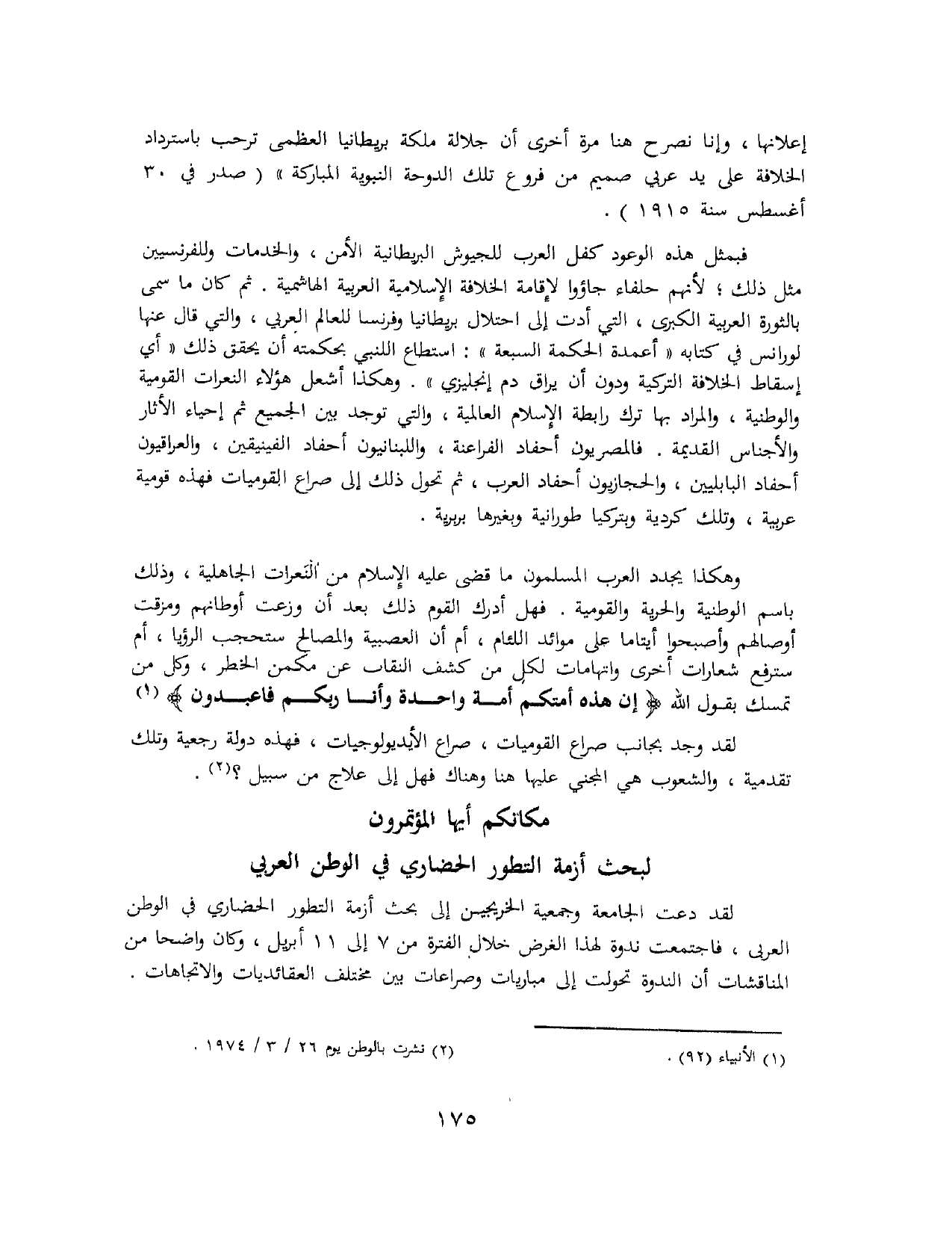 وهكذا يجدد العرب المسلمون ما قضى عليه الإسلام من النعرات الجاهلية، وذلك باسم الوطنية والحرية والقومية. فهل أدرك القوم ذلك بعد أن وزعت أوطانهم ومزقت أوصالهم وأصبحوا أيتامًا على موائد اللئام، أم أن العصبية والمصالح ستحجب الرؤيا، أم سترفع شعارات أخرى واتهامات لكل من كشف النقاب عن مكمن الخطر، وكل من تمسك بقول الله: {إِنَّ هَذِهِ أُمَّتُكُمْ أُمَّةً وَاحِدَةً وَأَنَا رَبُّكُمْ فَاعْبُدُونِ} (¬1).