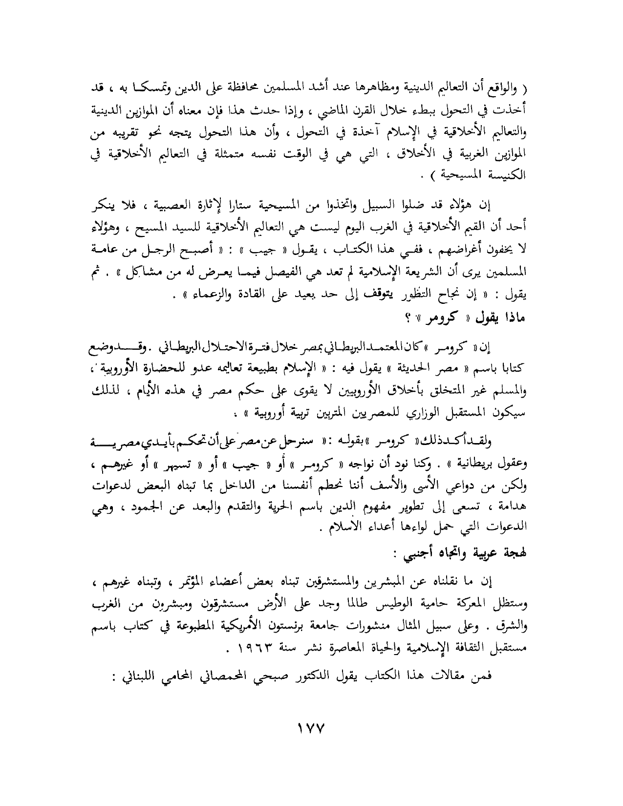 «والواقع أن التعاليم الدينية ومظاهرها عند أشد المسلمين محافظة على الدين وتمسكًا به، قد أخذت في التحول ببطء في الإسلام آخذة في التحول، وأن هذا التحول يتجه نحو تقريبه من الموازين الغربية في الأخلاق، التي هي في الوقت نفسه متمثلة في التعاليم الأخلاقية في الكنيسة المسيحية».