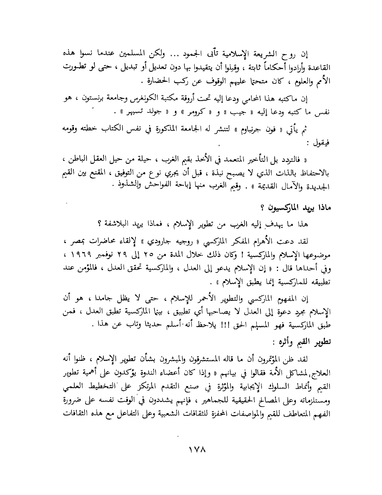ثم يأتي (فون جرونباوم) (*) لتنشر له الجامعة المذكورة في نفس الكتاب خطته وقومه فيقول: «فالتردد بل التأخير المتعمد في الأخذ بقيم الغرب، حيلة من حيل العقل الباطن، بالاحتفاظ بالذات الذي لا يصبح نبذة، قبل أن يجري نوع من التوفيق، المقنع بين القيم الجديدة والآمال القديمة». وقيم الغرب منها إباحة الفواحش والشذوذ.