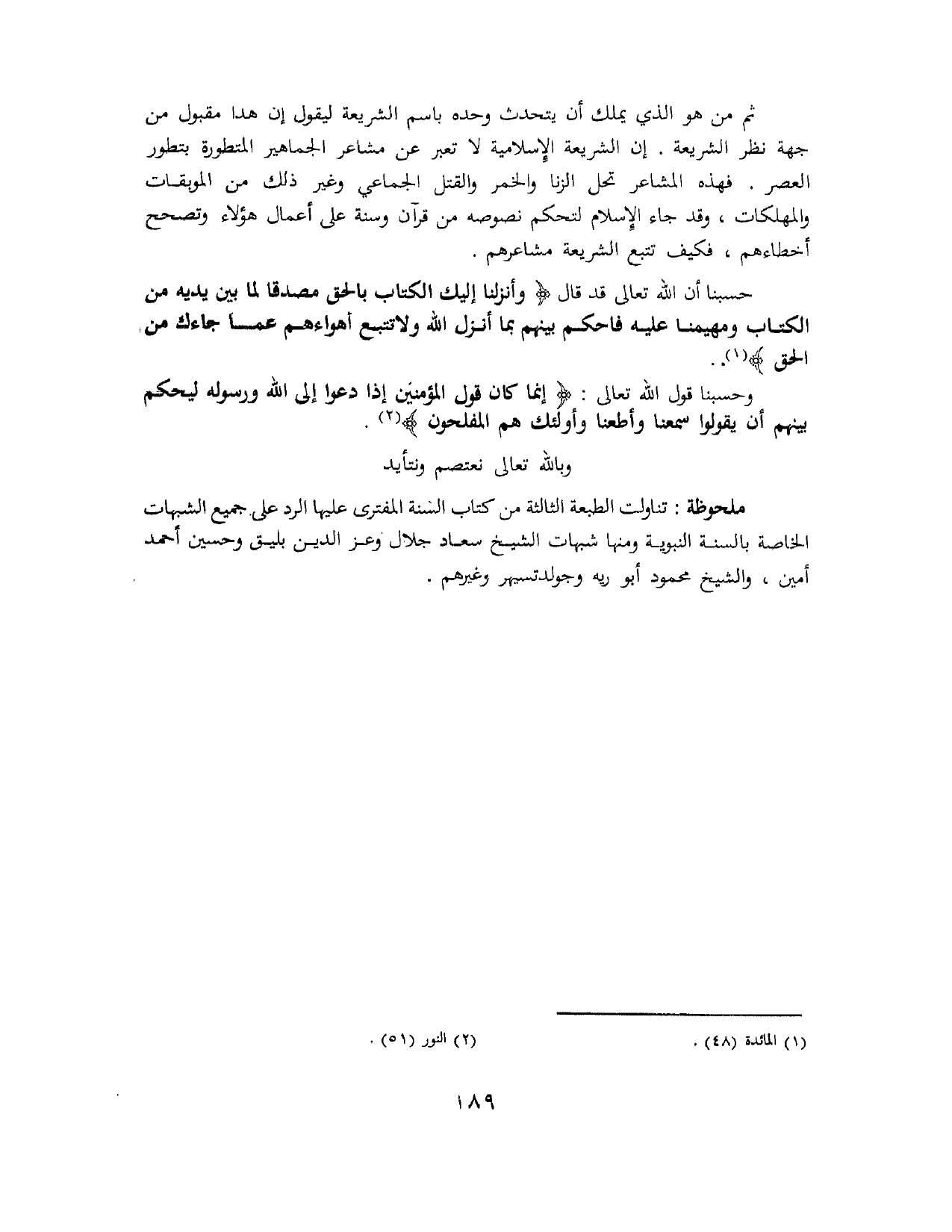 حسبنا أن الله تعالى قد قال: {وَأَنْزَلْنَا إِلَيْكَ الْكِتَابَ بِالْحَقِّ مُصَدِّقًا لِمَا بَيْنَ يَدَيْهِ مِنَ الْكِتَابِ وَمُهَيْمِنًا عَلَيْهِ فَاحْكُمْ بَيْنَهُمْ بِمَا أَنْزَلَ اللَّهُ وَلَا تَتَّبِعْ أَهْوَاءَهُمْ عَمَّا جَاءَكَ مِنَ الْحَقِّ} (¬1).