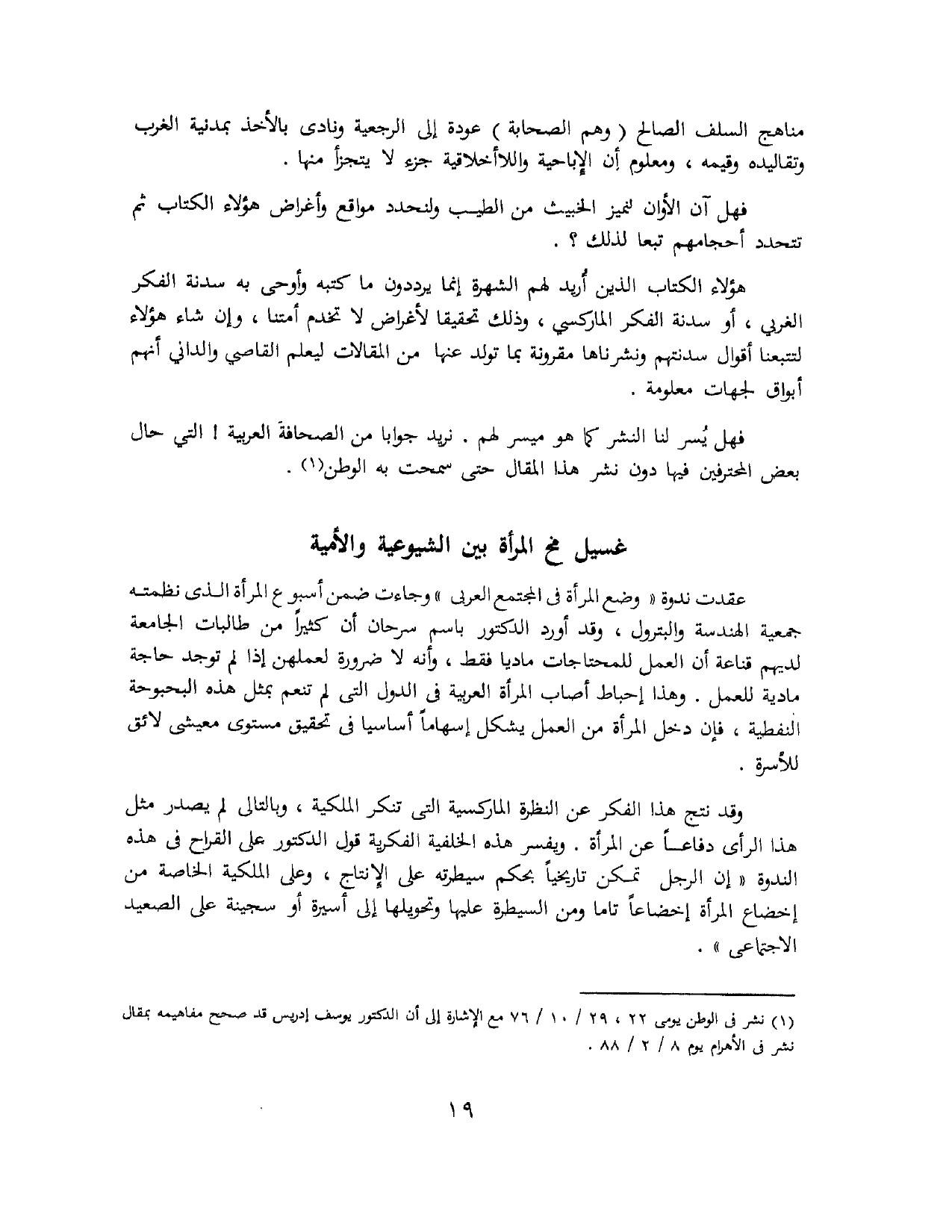 (¬1) نشر في " الوطن " يومي 22، 29/ 10 / 1976 مع الإشارة إلى أن الدكتور يوسف إدريس قد صحح مفاهيمه بمقال نشر في " الأهرام " يوم 8/ 2 / 1988.