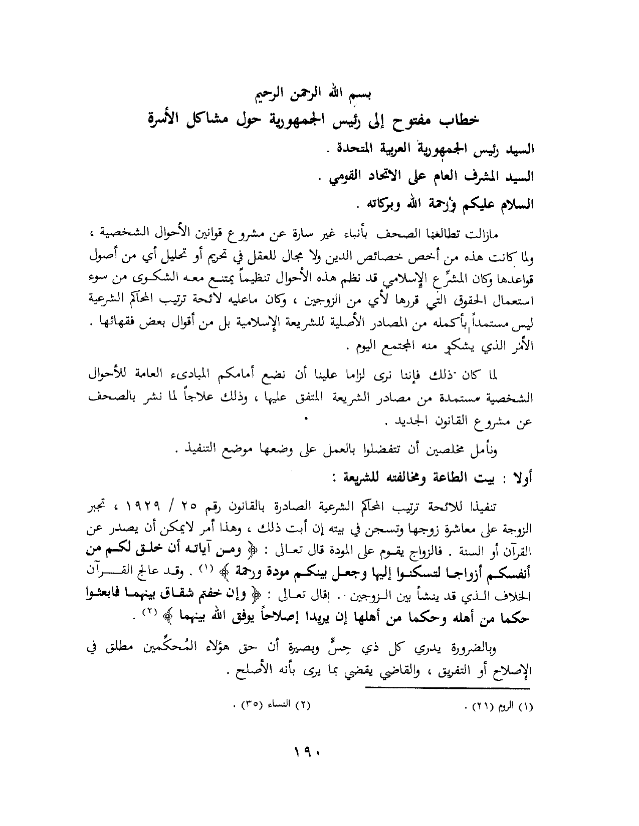 لما كان ذلك فإننا نرى لزامًا علينا أن نضع أمامكم المبادئ العامة للأحوال الشخصية مستمدة من مصادر الشريعة المتفق عليها، وذلك علاجًا لما نشر بالصحف عن مشروع القانون الجديد.