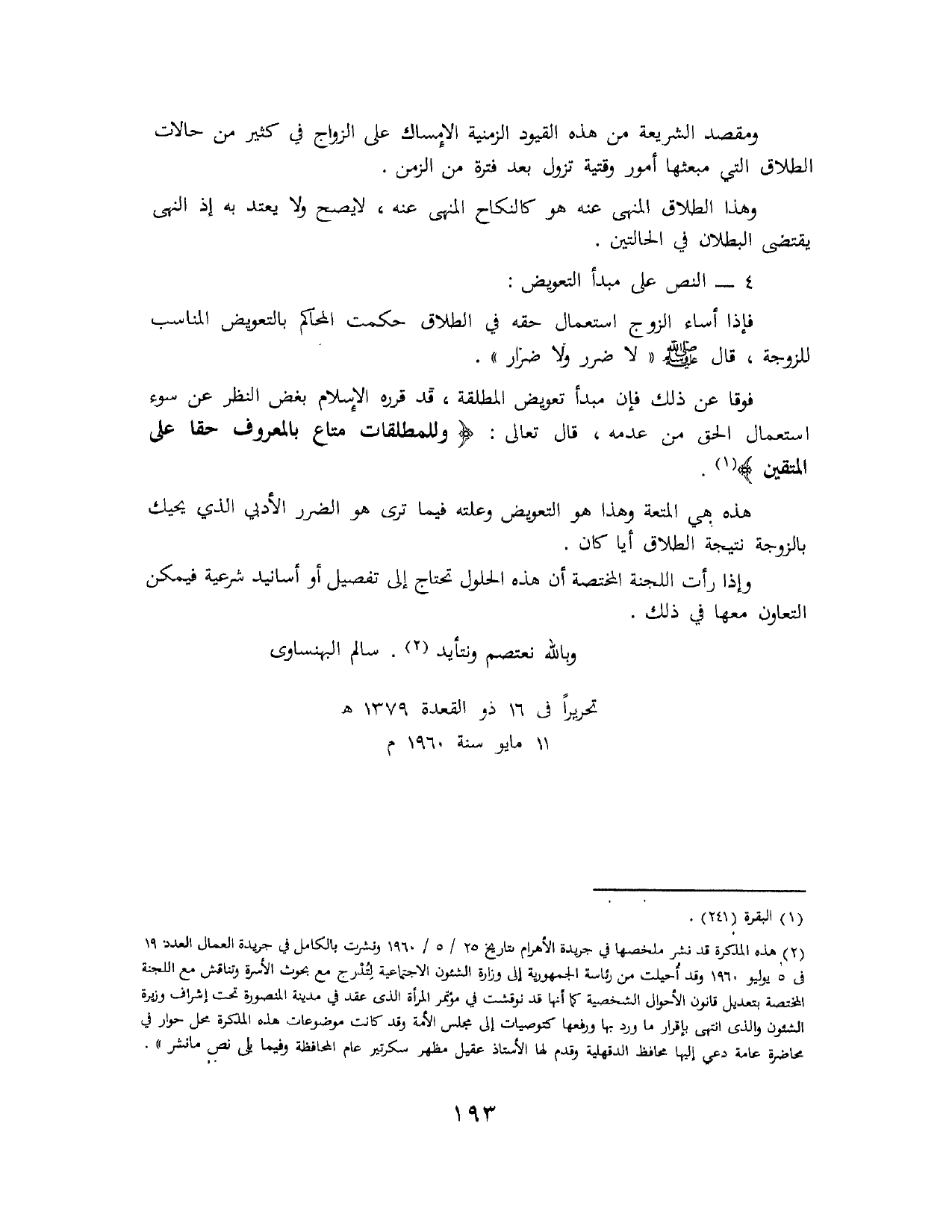 (¬2) هذه المذكرة قد نشر ملخصها في جريدة " الأهرام " بتاريخ 25/ 5 / 1960 ونشرت بالكامل في جريدة " العمال " العدد 19 في 5 يوليو 1960، وقد أحيلت من رئاسة الجمهورية إلى وزارة الشؤون الاجتماعية لتدرج مع بحوث الأسرة وتناقش مع اللجنة المختصة بتعديل قانون الأحوال الشخصية كما أنها قد نوقشت في مؤتمر المرأة الذي عقد في مدينة المنصورة تحت إشراف وزيرة الشؤون والذي انتهى بإقرار ما ورد بها ورفعها كتوصيات إلى مجلس الأمة وقد كانت موضوعات هذه المذكرة محل حوار في محاضرة عامة دعي إليها محافظ الدقهلية وقدم لها الأستاذ عقيل مظهر سكرتير عام المحافظة وفيما يلي نص ما نشر.