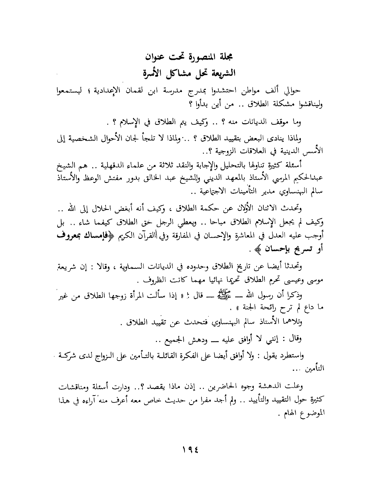 مَجَلَّةُ المَنْصُورَةِ تَحْتَ عُنْوَانِ " الشَّرِيعَةُ تَحُلُّ مَشَاكِلَ الأُسْرَةِ ":