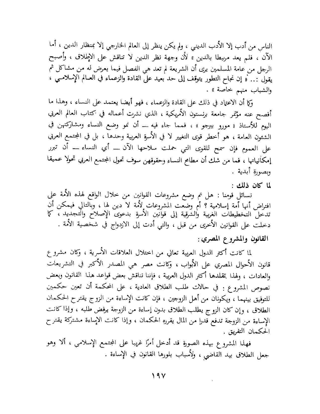 الناس من أدب إلا الأدب الديني، ولم يكن ينظر إلى العالم الخارجي إلا بمنظار الدين، أما الآن، فلم يعد مرتبطًا بالدين». لأن وجهة نظر الدين لا تناقش على الإطلاق، وأصبح الرجل من عامة المسلمين يرى أن الشريعة لم تعد هي الفصل فيما يعرض له من مشاكل ثم يقول: «إن نجاح التطور يتوقف إلى حد بعيد على القادة والزعماء في العالم الإسلامي، والشباب منهم خاصة».
