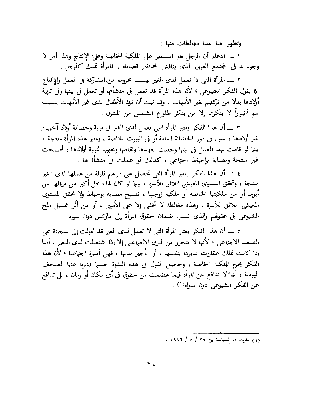 5 - أن هذا الفكر يعتبر المرأة التي لا تعمل لدى الغير قد تحولت إلى سجينة على الصعيد الاجتماعي؛ لأنها لا تتحرر من الرق الاجتماعي إلا إذا اشتغلت لدى الغير، أما إذا كانت تملك عقارات تديرها بنفسها، أو بأجير لديها، فهي أسيرة اجتماعيًا؛ لأن هذا الفكر يحرم الملكية الخاصة، وحاصل القول في هذه الندوة حسبما نشرته عنه الصحف اليومية، أنها لا تدافع عن المرأة فيما هضمت من حقوق في أي مكان أو زمان، بل تدافع عن الفكر الشيوعي دون سواه (¬1).