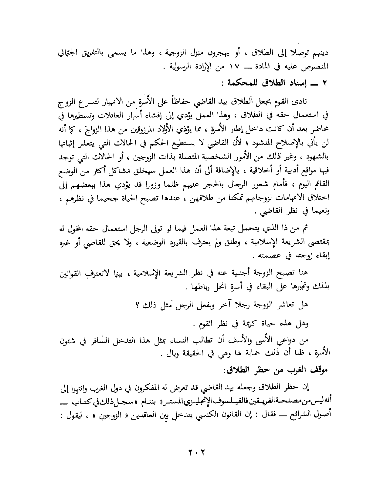 نادى القوم بجعل الطلاق بيد القاضي حفاظًا على الأسرة من الانهيار لتسرع الزوج في استعمال حقه في الطلاق، وهذا العمل يؤدي إلى إفشاء أسرار العائلات وتسطيرها في محاضر بعد أن كانت داخل إطار الأسرة، مما يؤذي الأولاد المرزوقين من هذا الزواج، كما أنه لن يأتي بالإصلاح المنشود، لأن القاضي لا يستطيع الحكم في الحالات التي يتعذر إثباتها بالشهود، وغير ذلك من الأمور الشخصية المتصلة بذات الزوجين، أو الحالات التي توجد فيها مواقع أدبية أو أخلاقية، بالإضافة إلى أن هذا العمل سيخلق مشاكل أكثر من الوضع القائم اليوم، فأمام شعور الرجال بالحجر عليهم ظلمًا وزورًا قد يؤدي هذا بعضهم إلى اختلاق الاتهامات لزوجاتهم تمكنًا من طلاقهن، عندها تصبح الحياة جحيمًا في نظرهم ونعيمًا في نظر القاضي.