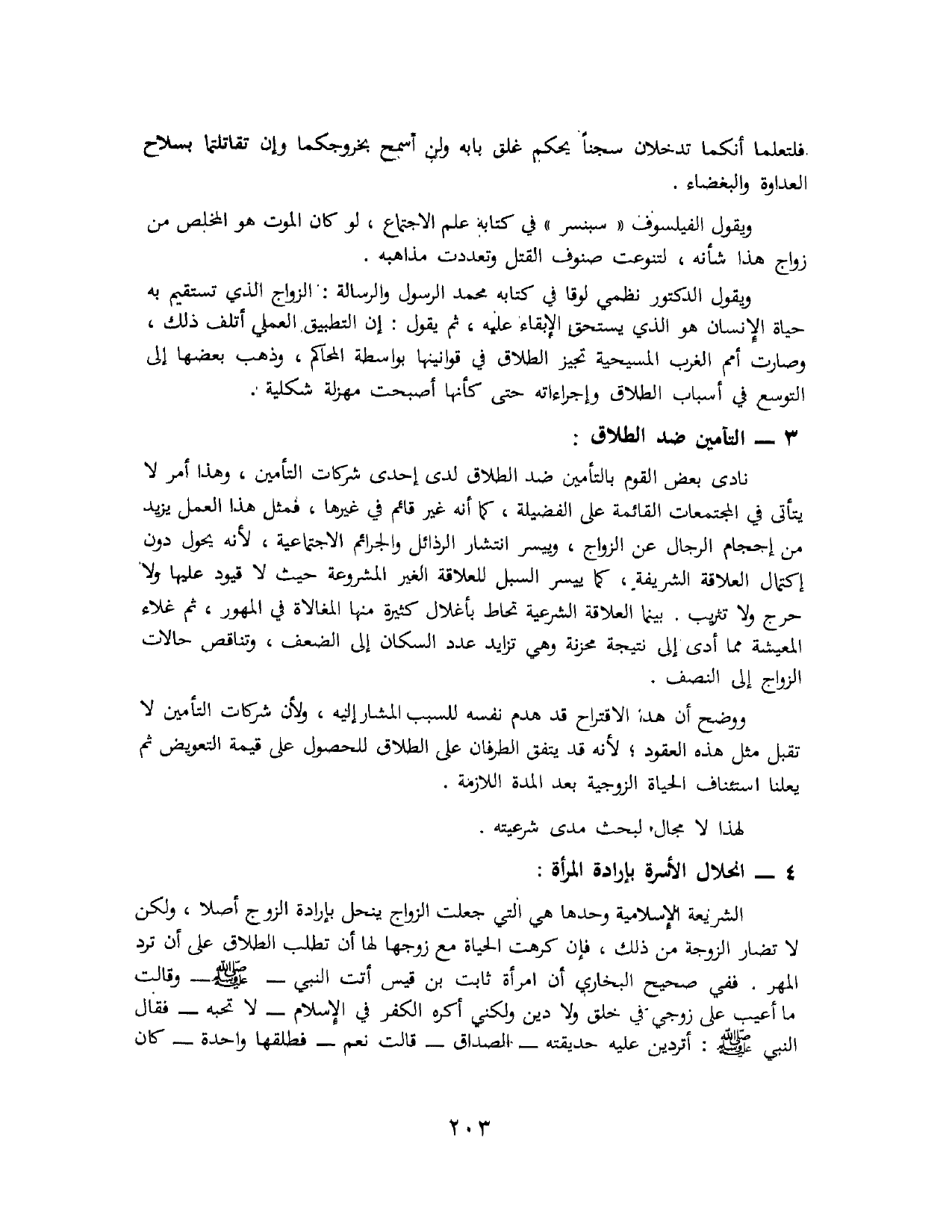 ووضح أن هذا الاقتراح قد هدم نفسه للسبب المشار إليه، ولأن شركات التأمين لا تقبل مثل هذه العقود، لأنه قد يتفق الطرفان على الطلاق للحصول على قيمة التعويض ثم يعلنا استئناف الحياة الروحية بعد المدة اللازمة.