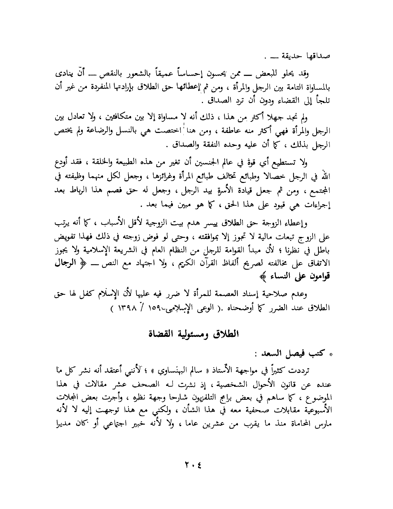 وعدم صلاحية إسناد العصمة للمرأة لا ضرر فيه عليها لأن الإسلام كفل لها حق الطلاق عند الضرر كما أوضحناه (" الوعي الإسلامي ": العدد 159/ 1398 هـ).