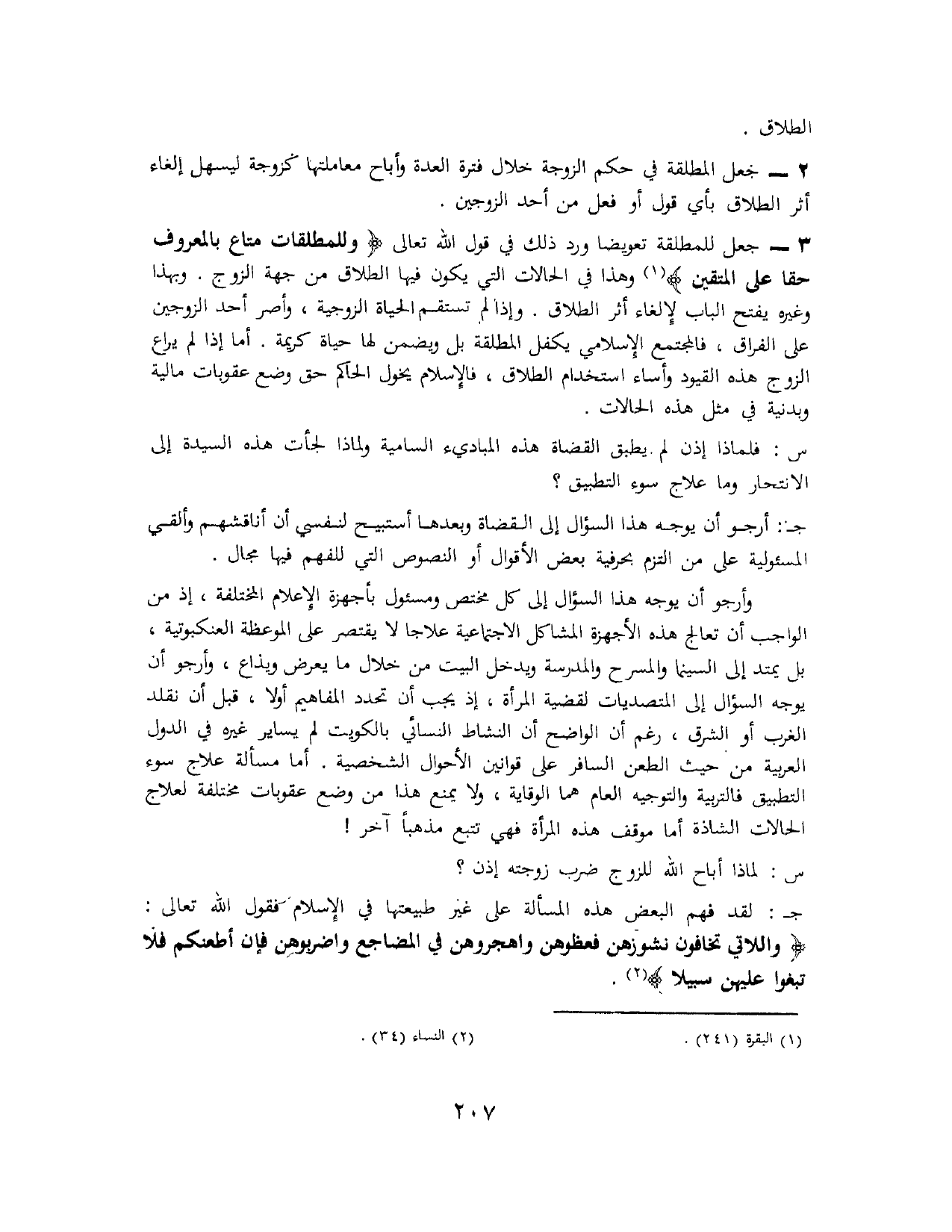 3 - جعل للمطلقة تعويضًا ورد ذلك في قول الله تعالى: {وَلِلْمُطَلَّقَاتِ مَتَاعٌ بِالْمَعْرُوفِ حَقًّا عَلَى الْمُتَّقِينَ} (¬1). وهذا في الحالات التي يكون فيها الطلاق من جهة الزوج. وبهذا وغيره يفتح الباب لإلغاء أثر الطلاق. وإذا لم تستقم الحياة الزوجية، وأصر أحد الزوجين على الفراق، فالمجتمع الإسلامي يكفل المطلقة بل ويضمن لها حياة كريمة. أما إذا لم يراع الزوج هذه القيود وأساء استخدام الطلاق، فالإسلام يخول الحاكم حق وضع عقوبات مالية وبدنية في مثل هذه الحالات.