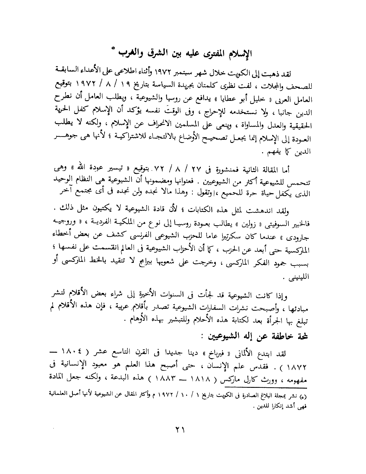 (*) نشر بمجلة " البلاغ " الصادرة في الكويت بتاريخ 1/ 10 / 1972 م وأكثر المقال عن الشيوعية لأنها أصل العلمانية فهي أشد إنكارًا للدين.