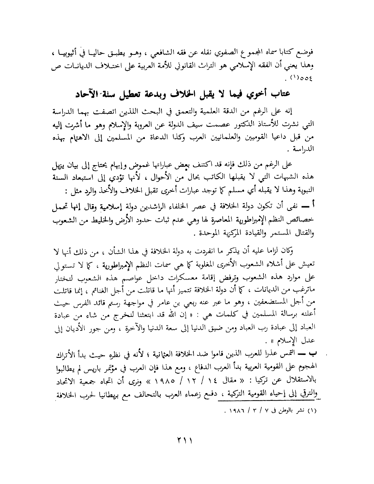 إنه على الرغم من الدقة العلمية والتعمق في البحث اللذين اتصفت بهما الدراسة التي نشرت للأستاذ الدكتور عصمت سيف الدولة عن العروبة والإسلام وهو ما أشرت إليه من قبل داعيًا القوميين والعلمانيين العرب وكذا الدعاة من المسلمين إلى الاهتمام بهذه الدراسة.