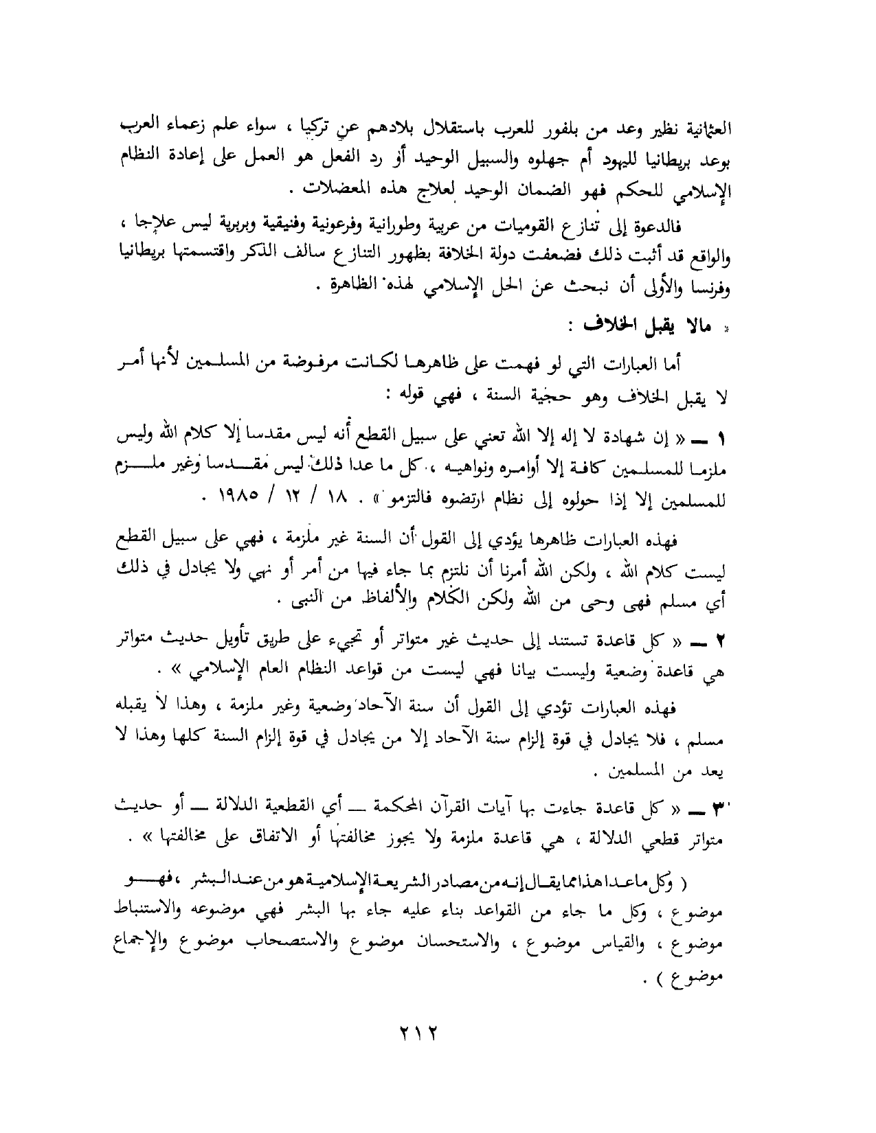 2 - «كل قاعدة تستند إلى حديث غير متواتر أو تجيء عن طريق تأويل حديث متواتر هي قاعدة وضعية وليست بيانًا فهي ليست من قواعد النظام العام الإسلامي».