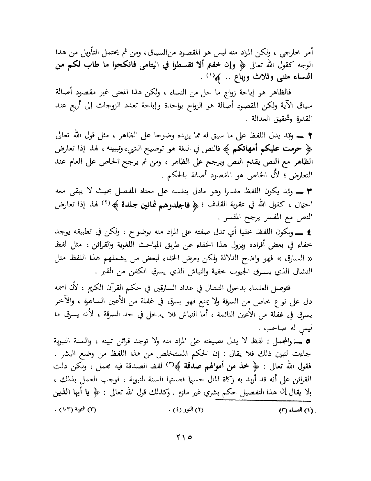 3 - وقد يكون اللفظ مفسرًا وهو ما دل بنفسه على معناه المفصل بحيث لا يبقى معه احتمال، كقول الله في عقوبة القذف: {فَاجْلِدُوهُمْ ثَمَانِينَ جَلْدَةً} (¬2)، لهذا إذا تعارض النص مع المفسر يرجح المفسر.