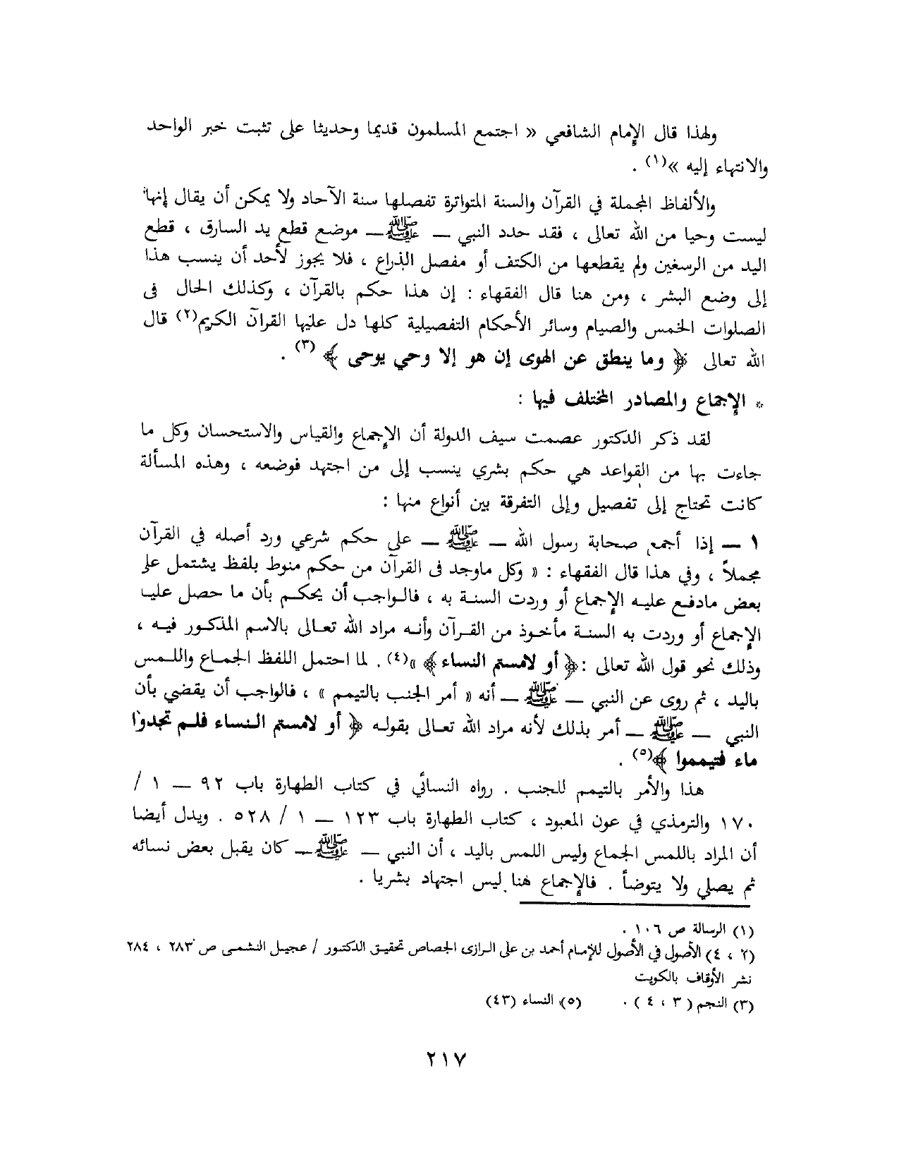 (**) في الكتاب المطبوع خطأ في الطباعة: («والترمذي في " عون المعبود "» نقلاً عن " الفصول في الأصول: هامش ص 283 حيث قال الدكتور النشمي: وعون المعبود، كتاب الطهارة ... ولم يذكر «والترمذي في " عون المعبود "»). والحديث في " سنن أبي داود "، تحقيق عزت عبيد الدعاس وعادل السيد، رقم الحديث 321، 1/ 164، الطبعة الأولى: 1418هـ - 1997 م، دار ابن حزم - بيروت.