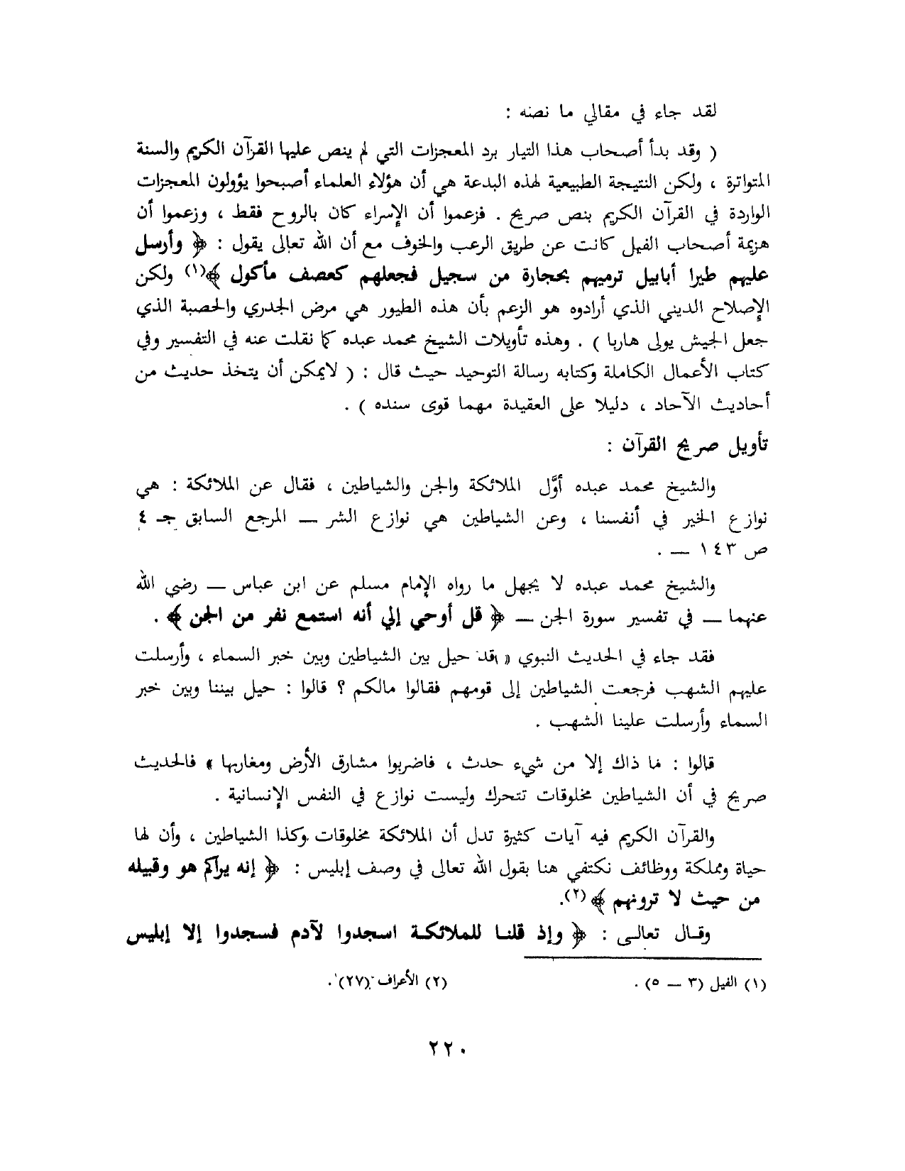 «وقد بدأ أصحاب هذا التيار برد المعجزات التي لم ينص عليها القرآن الكريم والسنة المتواترة، ولكن النتيجة الطبيعية لهذه البدعة هي أن هؤلاء العلماء أصبحوا يؤولون المعجزات الواردة في القرآن الكريم بنص صريح. فزعموا أن الإسراء كان بالروح فقط، وزعموا أن هزيمة أصحاب الفيل كانت عن طريق الرعب والخوف مع أن الله تعالى يقول: {وَأَرْسَلَ عَلَيْهِمْ طَيْرًا أَبَابِيلَ، تَرْمِيهِمْ بِحِجَارَةٍ مِنْ سِجِّيلٍ، فَجَعَلَهُمْ كَعَصْفٍ مَأْكُولٍ} (¬1) ولكن الإصلاح الديني الذي أرادوه هو الزعم بأن هذه الطيور هي مرض الجدري والحصبة الذي جعل الجيش يولي هاربًا». وهذه تأويلات الشيخ محمد عبده كما نقلت عنه في " التفسير " وفي " الأعمال الكاملة " وكتابه " رسالة التوحيد " حيث قال: «لاَ يُمْكِنُ أَنْ يُتَّخَذَ حَدِيثٌ مِنْ أَحَادِيثِ الآحَادِ، دَلِيلاَ عَلَى العَقِيدَةِ مَهْمَا قَوِيَ سَنَدُهُ».