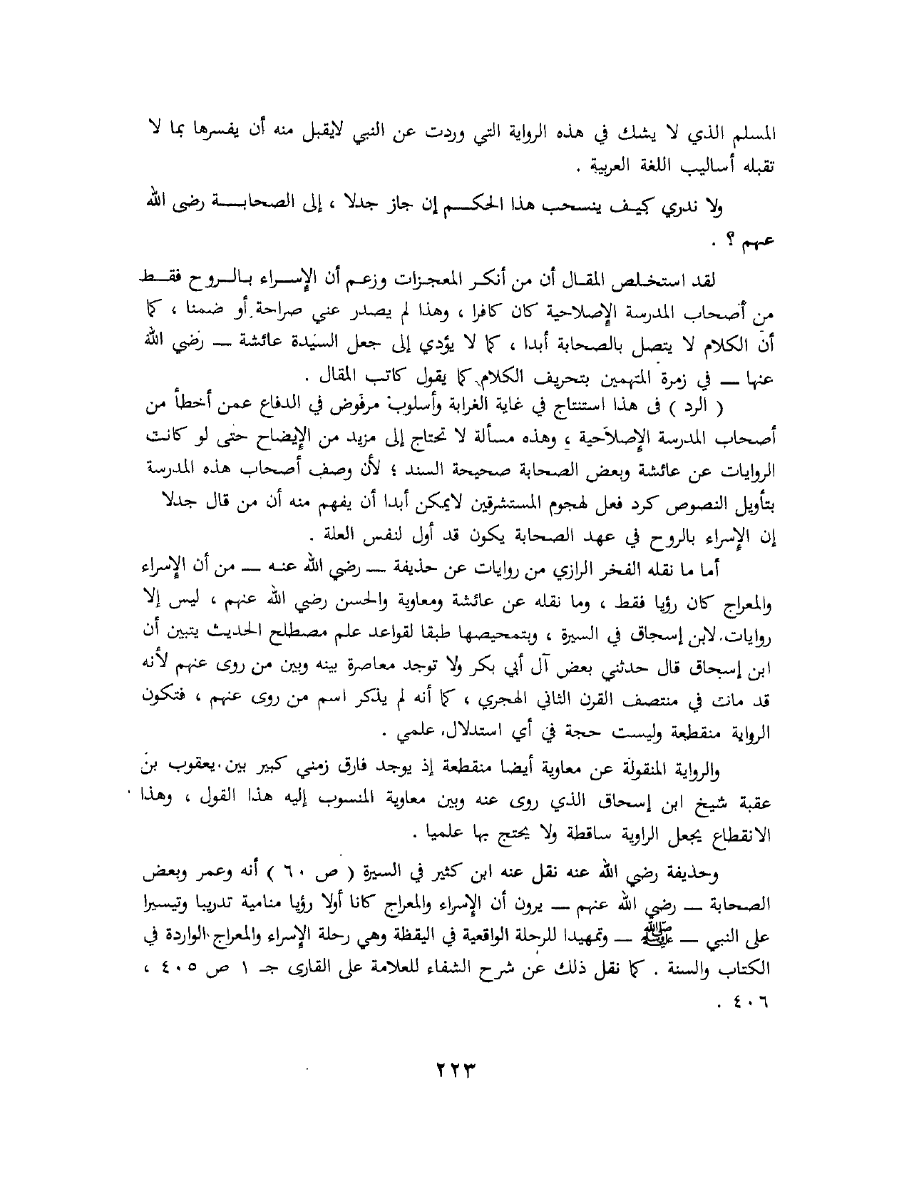 (الرد) في هذا استنتاج في غاية الغرابة وأسلوب مرفوض في الدفاع عمن أخطأ من أصحاب المدرسة الإصلاحية، وهذه مسألة لا تحتاج إلى مزيد من الإيضاح حتى لو كانت الروايات عن عائشة وبعض الصحابة صحيحة السند، لأن وصف أصحاب هذه المدرسة بتأويل النصوص كرد فعل لهجوم المستشرقين لا يمكن أبدًا أن يفهم منه أن من قال جدلاً إن الإسراء بالروح في عهد الصحابة يكون قد أَوَّلَ لنفس العلة.