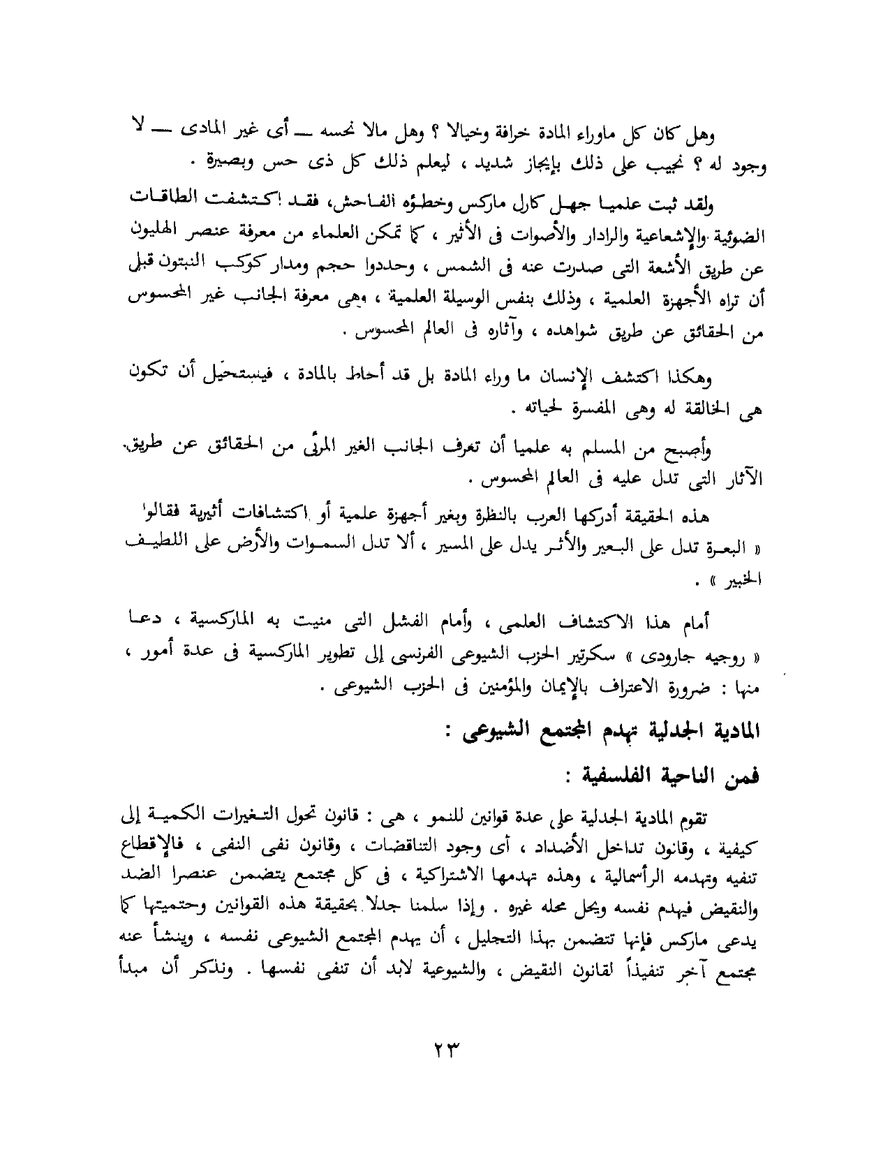 ولقد ثبت علميًا جهل (كارل ماركس) وخطؤه الفاحش، فقد اكتشفت الطاقات الضوئية والإشعاعية والرادار والأصوات في الأثير، كما تمكن العلماء من معرفة عنصر الهليون عن طريق الأشعة التي صدرت عنه في الشموس، وحددوا حجم ومدار كوكب النبتون قبل أن تراه الأجهزة العلمية، وذلك بنفس الوسيلة العلمية، وهي معرفة الجانب غير المحسوس من الحقائق عن طريق شواهده، وآثاره في العالم المحسوس.