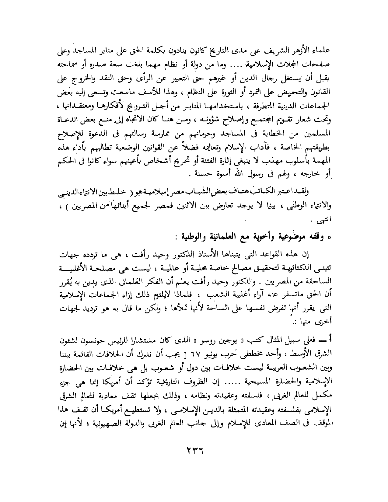 علماء الأزهر الشريف على مدى التاريخ كانوا ينادون بكلمة الحق على منابر المساجد وعلى صفحات المجلات الإسلامية ... وما من دولة أو نظام مهما بلغت سعة صدره أو سماحته يقبل أن يستغل رجال الدين أو غيرهم حق التعبير عن الرأي وحق النقد والخروج على القانون والتحريض على التمرد أو الثورة على النظام، وهذا للأسف ما سعت وتسعى إليه بعض الجماعات الدينية المتطرفة، باستخدامها المنابر من أجل الترويج لأفكارها ومعتقداتها، وتحت شعار تقويم المجتمع وإصلاح شؤونه، ومن هنا كان الاتجاه إلى منع بعض الدعاة المسلمين من الخطابة في المساجد وحرمانهم من ممارسة رسالتهم في الدعوة للإصلاح بطريقتهم الخاصة، فآداب الإسلام وتعاليمه فضلاً عن القوانين الوضعية تطالبهم بأداء هذه المهمة بأسلوب مهذب لا ينبغي إثارة الفتنة أو تجريح أشخاص بأعينم سواءً كانوا في الحكم أو خارجه، ولهم في رسول الله أسوة حسنة.