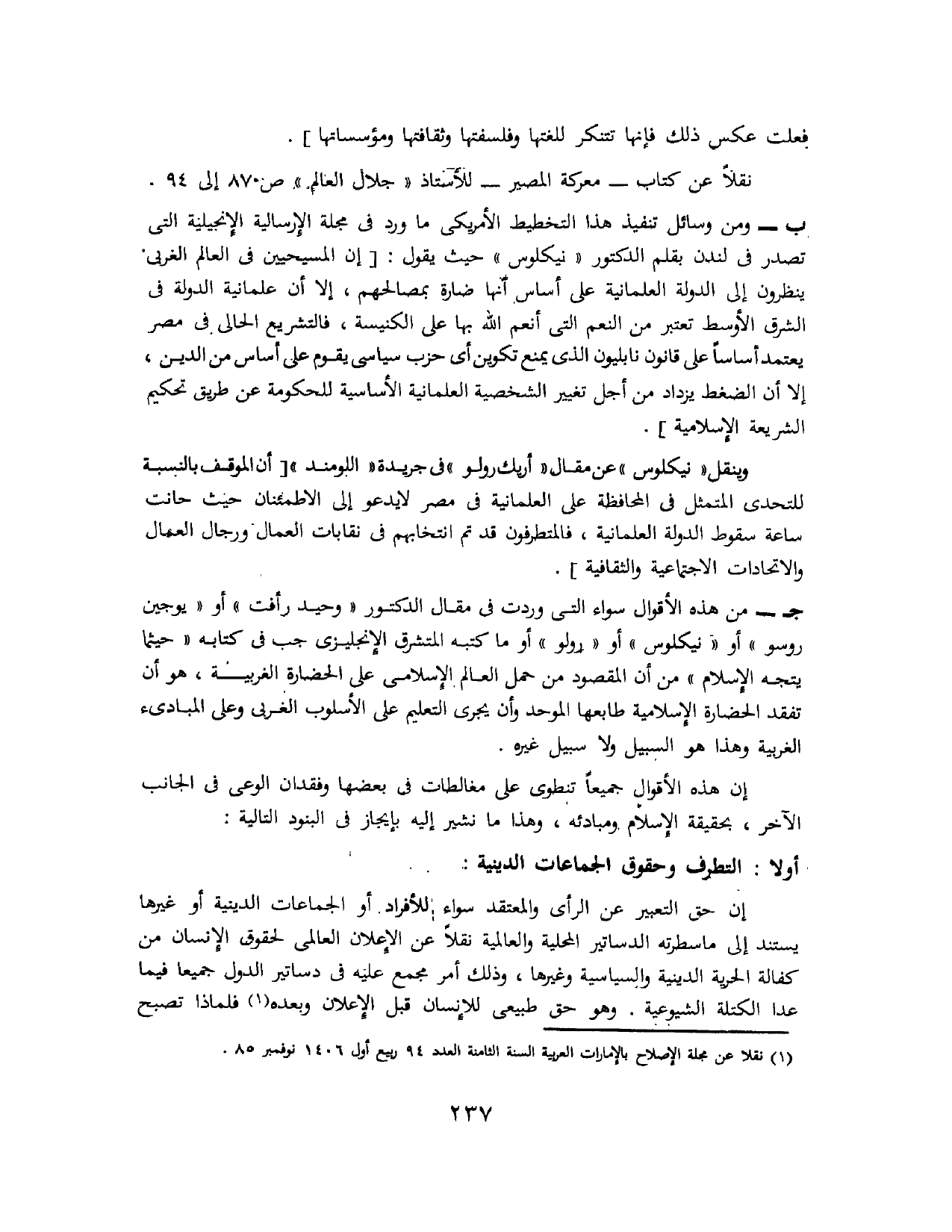 (¬1) نقلاً عن مجلة " الإصلاح " بالإمارات العربية، السنة الثامنة، العدد 94 ربيع أول 1406 هـ - نوفمبر 1985 م.