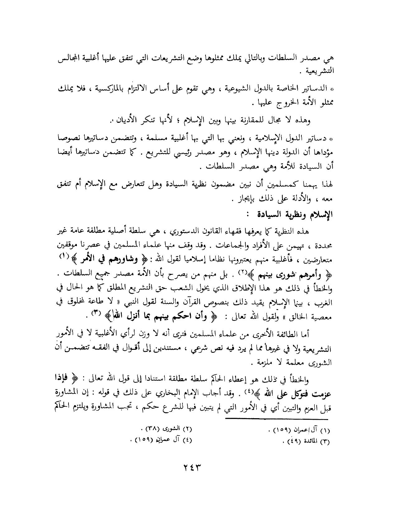 والخطأ في ذلك هو هذا الإطلاق الذي يخول الشعب حق التشريع المطلق كما هو الحال في الغرب، بينما الإسلام يقيد ذلك بنصوص القرآن والسنة لقول النبي - صَلَّى اللَّهُ عَلَيْهِ وَسَلَّمَ -: «لَا طَاعَةَ لِمَخْلُوقٍ فِي مَعْصِيَةِ الخَالِقِ»، ولقول الله تعالى: {وَأَنِ احْكُمْ بَيْنَهُمْ بِمَا أَنْزَلَ اللَّهُ} (¬3).
