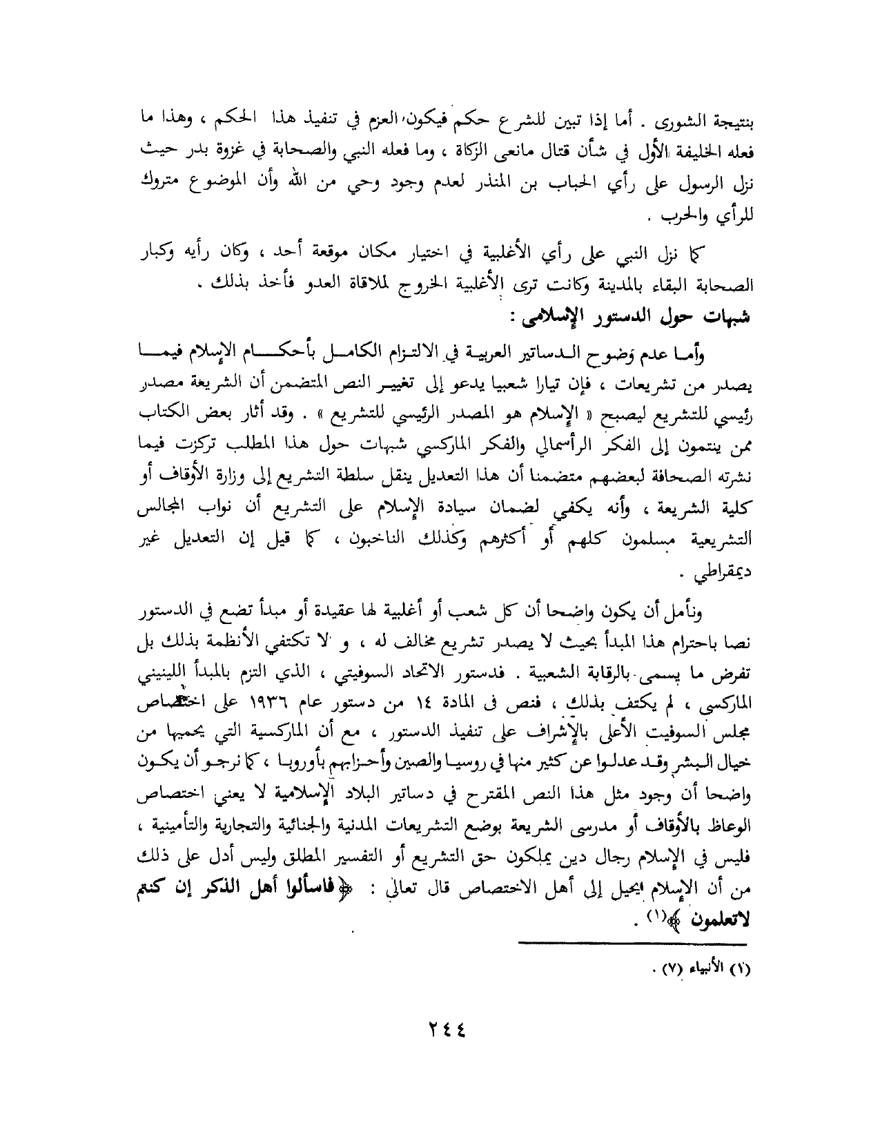 ونأمل أن يكون واضحًا أن كل شعب أو أغلبية لها عقيدة أو مبدأ تضع في الدستور نصًا باحترام هذا المبدأ بحيث لا يصدر تشريع مخالف له، ولا تكتفي الأنظمة بذلك بل تفرض ما يسمى بالرقابة الشعبية. فدستور الاتحاد السوفياتي، الذي التزم بالمبدأ اللينيني الماركسي، لم يكتف بذلك، فنص في المادة 14 من دستور عام 1936 على اختصاص مجلس السوفيات الأعلى بالإشراف على تنفيذ الدستور، مع أن الماركسية التي يحميها من خيال االبشر وقد عدلوا عن كثير منها في روسيا والصين وأحزابهم بأوروبا كما نرجو أن يكون واضحًا أن وجود مثل هذا النص المقترح في دساتير البلاد الإسلامية لا يعني اختصاص الوعاظ بالأوقاف أو مدرسي الشريعة بوضع التشريعات المدنية والجنائية والتجارية والتأمينية، فليس في الإسلام رجال دين يملكون حق التشريع أو التفسير المطلق وليس أدل على ذلك من أن الإسلام يحيل إلى أهل الاختصاص. قال تعالى: {فَاسْأَلُوا أَهْلَ الذِّكْرِ إِنْ كُنْتُمْ لَا تَعْلَمُونَ} (¬1).