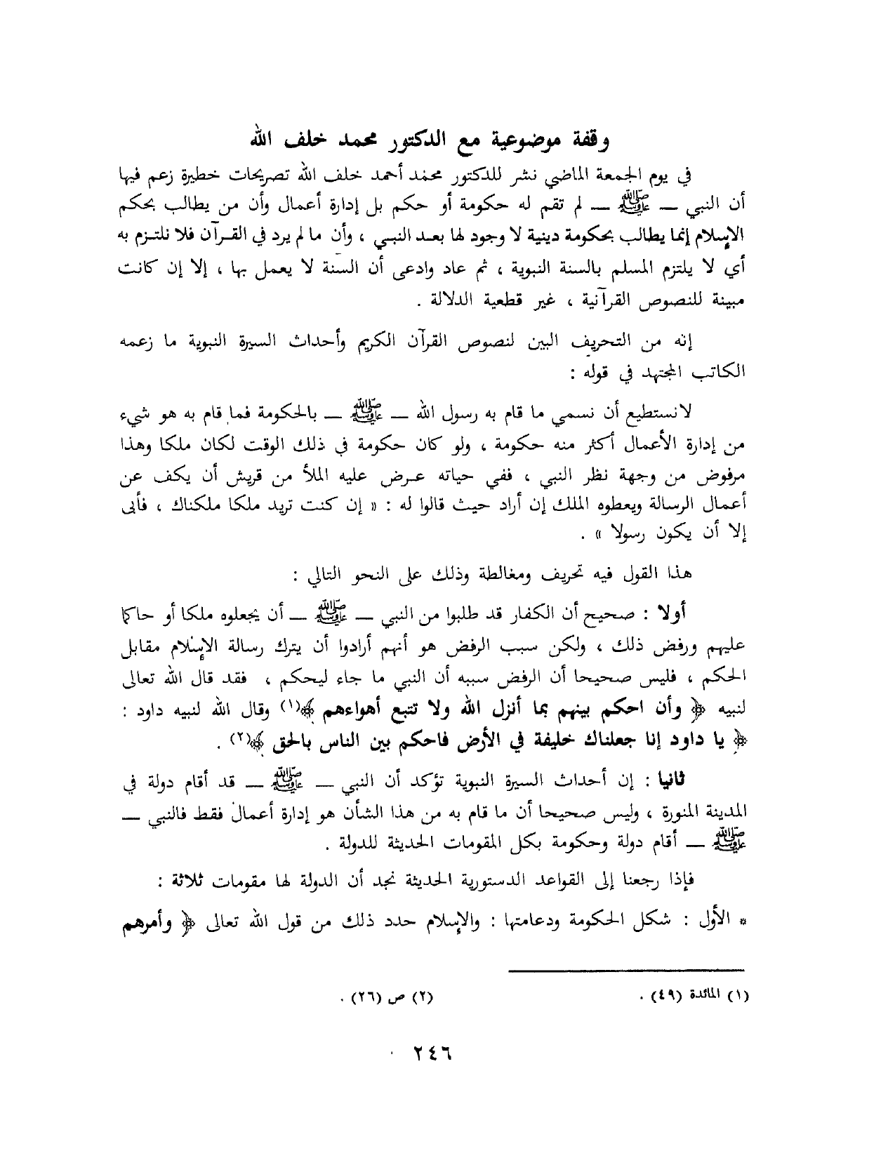 في يوم الجمعة الماضي نشر للدكتور محمد أحمد خلف الله تصريحات خطيرة زعم فيها أن النبي - صَلَّى اللَّهُ عَلَيْهِ وَسَلَّمَ - لم تقم له حكومة أو حكم بل إدارة أعمال وأن من يطالب بحكم الإسلام إنما يطالب بحكومة دينية لا وجود لها بعد النبي، وأن ما لم يرد في القرآن فلا نلتزم به أي لا يلتزم المسلم بالسنة النبوية، ثم عاد وادعى أن السنة لا يعمل بها، إلا إن كانت مبنية للنصوص القرآنية، غير قطعية الدلالة.