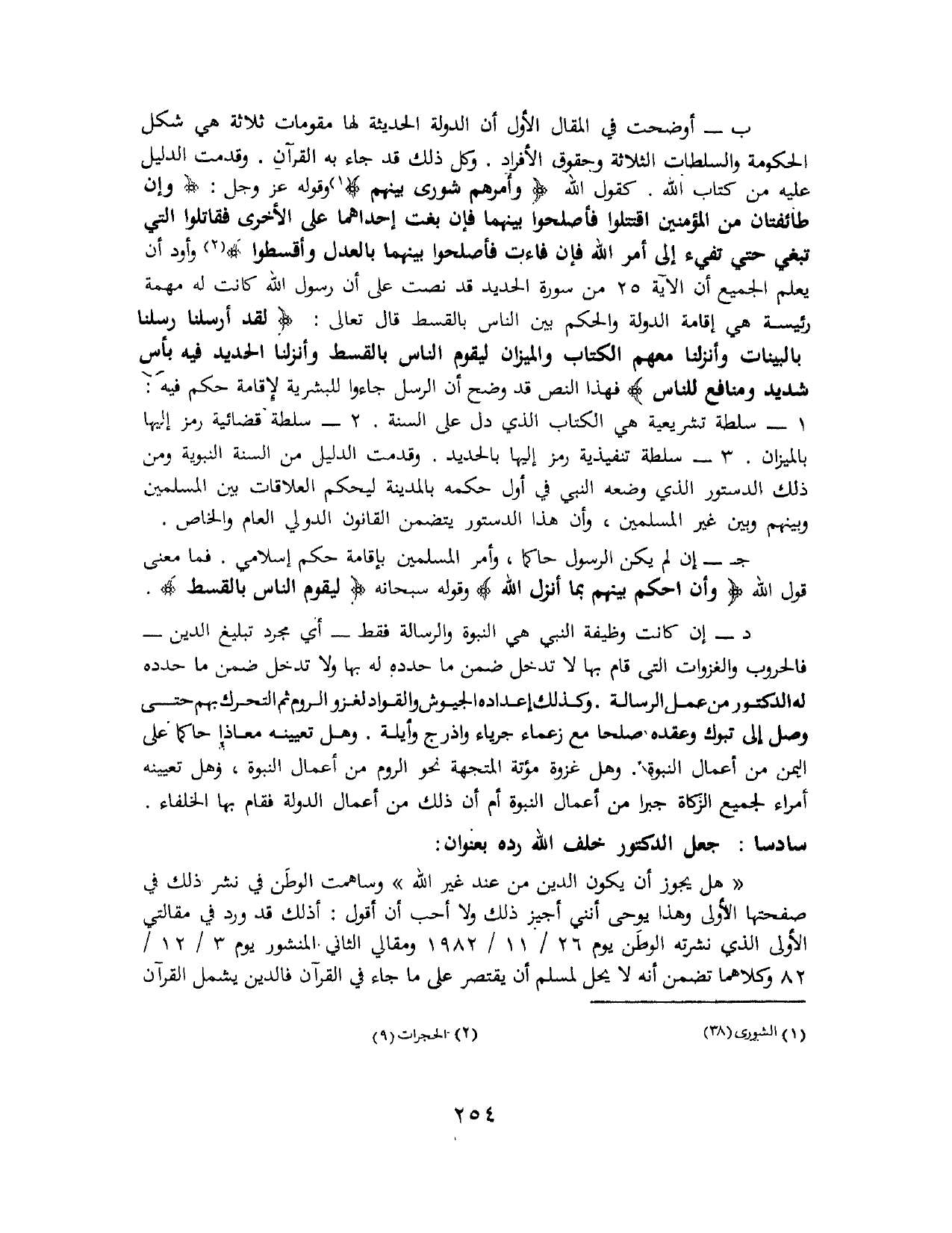 ب - أوضحت في المقال الأول أن الدولة الحديثة لها مقومات ثلاثة هي شكل الحكومة والسلطات الثلاثة وحقوق الأفراد. وكل ذلك قد جاء به القرآن. وقدمت الدليل عليه من كتاب الله، كقول الله: {وَأَمْرُهُمْ شُورَى بَيْنَهُمْ} (¬1). وقوله - عَزَّ وَجَلَّ -: {وَإِنْ طَائِفَتَانِ مِنَ الْمُؤْمِنِينَ اقْتَتَلُوا فَأَصْلِحُوا بَيْنَهُمَا فَإِنْ بَغَتْ إِحْدَاهُمَا عَلَى الْأُخْرَى فَقَاتِلُوا الَّتِي تَبْغِي حَتَّى تَفِيءَ إِلَى أَمْرِ اللَّهِ فَإِنْ فَاءَتْ فَأَصْلِحُوا بَيْنَهُمَا بِالْعَدْلِ وَأَقْسِطُوا} (¬2). وأود أن يعلم الجميع أن الآية 25 من سورة الحديد قد نصت على أن رسول الله كانت له مهمة رئيسة هي إقامة الدولة والحكم بين الناس بالقسط، قال تعالى: {لَقَدْ أَرْسَلْنَا رُسُلَنَا بِالْبَيِّنَاتِ وَأَنْزَلْنَا مَعَهُمُ الْكِتَابَ وَالْمِيزَانَ لِيَقُومَ النَّاسُ بِالْقِسْطِ وَأَنْزَلْنَا الْحَدِيدَ فِيهِ بَأْسٌ شَدِيدٌ وَمَنَافِعُ لِلنَّاسِ} [الحديد: 25]. فهذا النص قد وضح أن الرسل جاءوا للبشرية لإقامة حكم فيه: