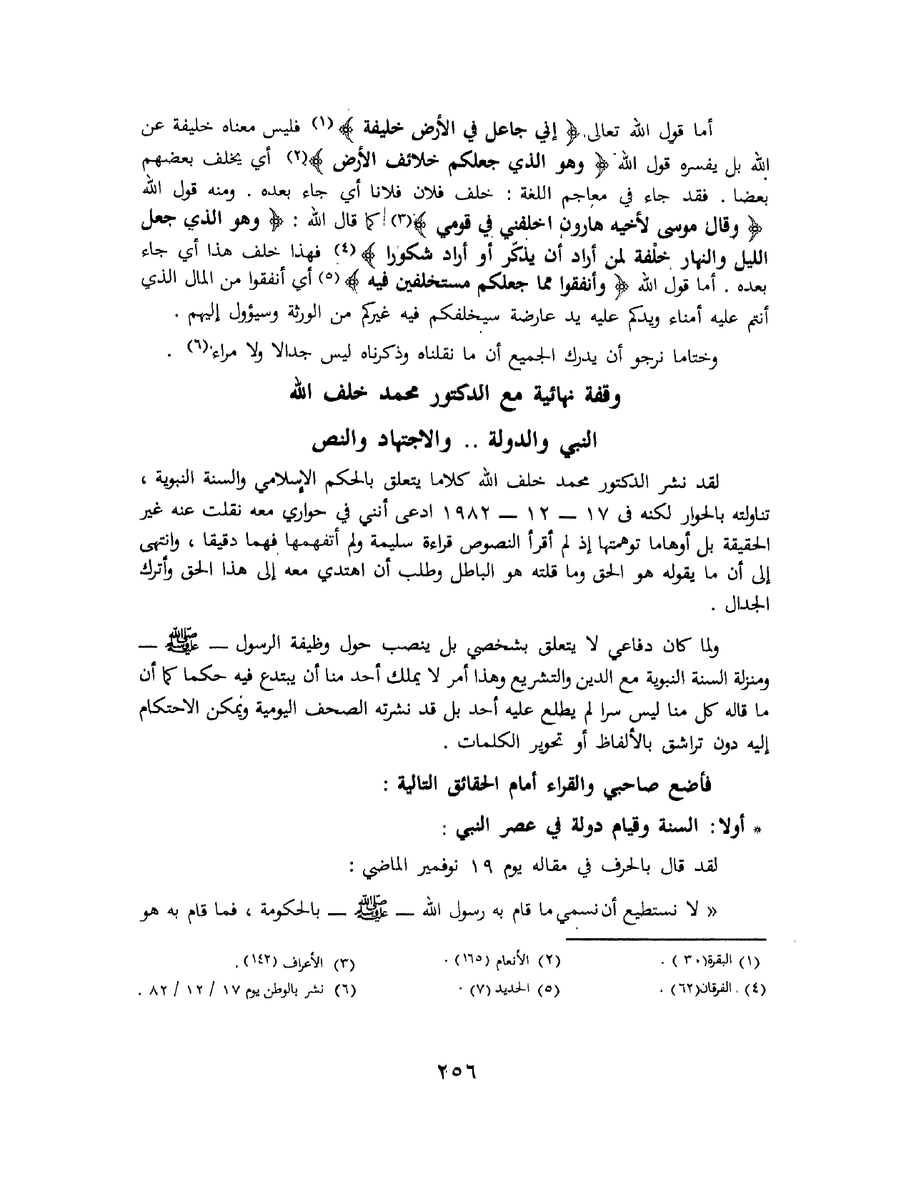 لقد نشر الدكتور محمد خلف الله كلامًا يتعلق بالحكم الإسلامي والسنة النبوية، تناولته بالحوار لكنه في 17/ 12 / 1982 ادعى أنني في حواري معه نقلت عنه غير الحقيقة بل أوهامًا توهمتها إذ لم أقرأ النصوص قراءة سليمة ولم أفهمها فهمًا دقيقًا، وانتهى إلى أن ما يقوله هو الحق وما قلته هو الباطل وطلب أن أهتدي معه إلى هذا الحق وأترك الجدال.