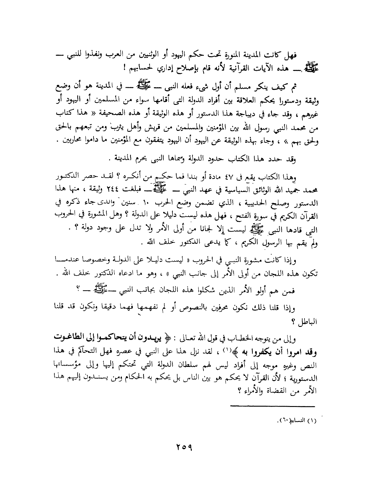 وهذا الكتاب يقع في 47 مادة أو بُنْدًا، فما حكم من أنكره؟ لقد حصر الدكتور محمد حميد الله الوثائق السياسية في عهد النبي - صَلَّى اللَّهُ عَلَيْهِ وَسَلَّمَ - فبلغت 244 وثيقة، منها هذا الدستور وصلح الحديبية، الذي تضمن وضع الحرب 10 سنين، والذي جاء ذكره في القرآن الكريم في سورة الفتح، فهل هذه ليست دليلاً على الدولة؟ وهل المشورة في الحروب التي قادها النبي - صَلَّى اللَّهُ عَلَيْهِ وَسَلَّمَ - ليست إلا لجانًا من أولي الأمر ولا تدل على وجود دولة؟.