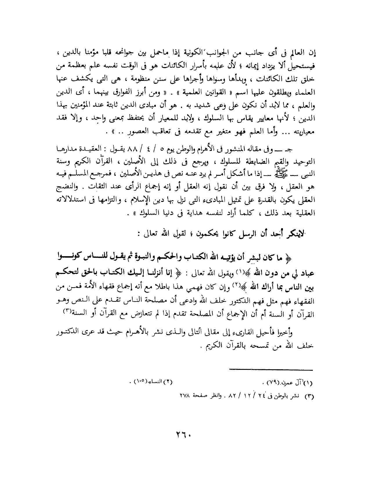 ج - وفي مقاله المنشور في " الأهرام " و" الوطن " يوم 5/ 4 / 1988 يقول: «العقيدة مدارها التوحيد والقيم الضابطة للسلوك، ويرجع في ذلك إلى الأصلين، القرآن الكريم وسنة النبي - صَلَّى اللَّهُ عَلَيْهِ وَسَلَّمَ - إذا ما أشكل أمر لم يرد عنه نص في هذين الأصلين، فمرجع المسلم فيه هو العقل، ولا فرق بين أن نقول إنه العقل أو إنه إجماع الرأي عند الثقات. والنضج العقلي يكون بالقدرة على تمثيل المبادئ التي نزل بها دين الإسلام، والتزامها في استدلالاته العقلية بعد ذلك، كلما أراد لنفسه هداية في دنيا السلوك».