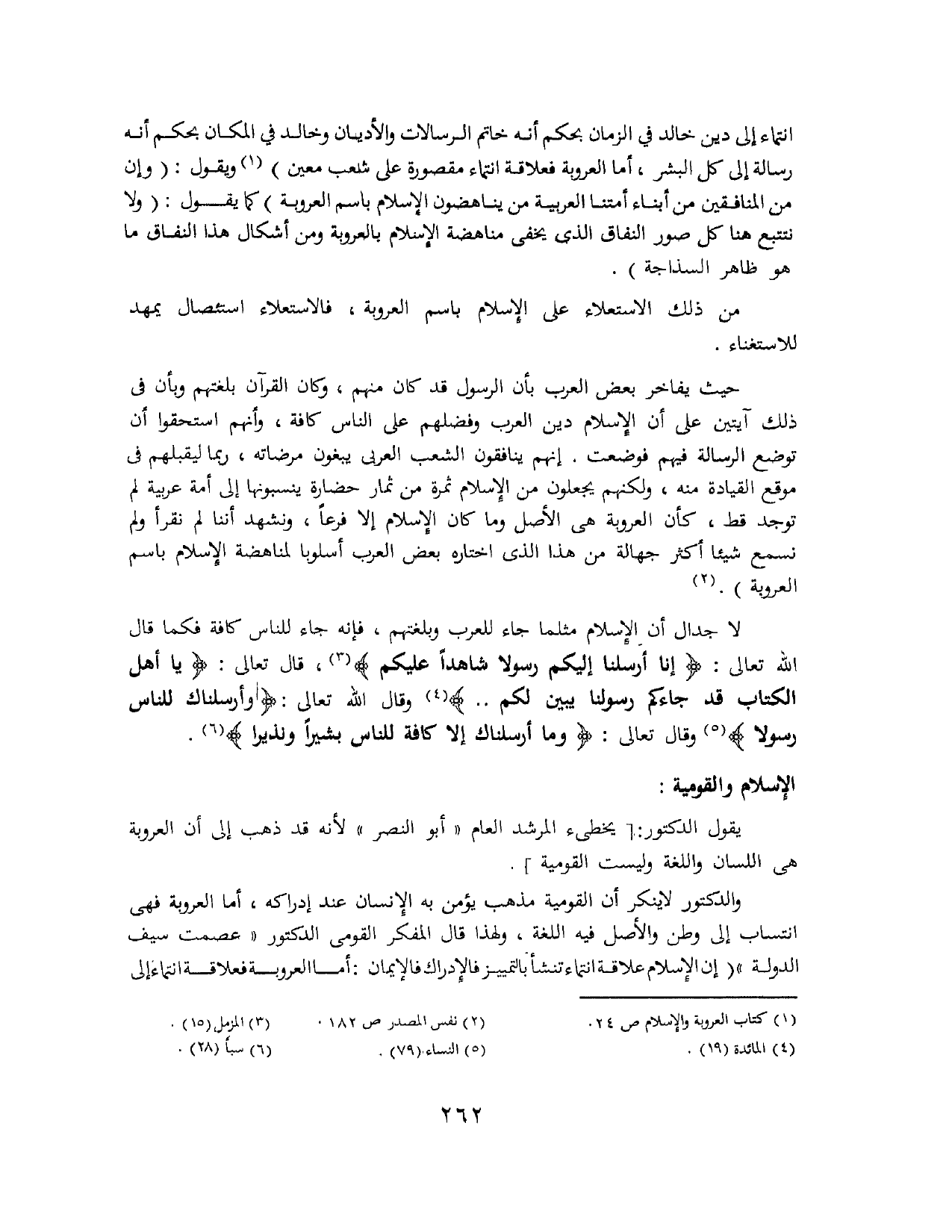 انتماءً إلى دين خالد في الزمان بحكم أنه خاتم الرسالات والأديان وخالد في المكان بحكم أنه رسالة إلى كل البشر، أما العروبة فعلاقة انتماء مقصورة على شعب معين» (¬1)، ويقول: «وإن من المنافقين من أبناء أمتنا العربية من يناهضون الإسلام باسم العروبة»، كما يقول: «ولا نتتبع هنا كل صور النفاق الذي يخفي مناهضة الإسلام بالعروبة ومن أشكال هذا النفاق هو ظاهر السذاجة ...