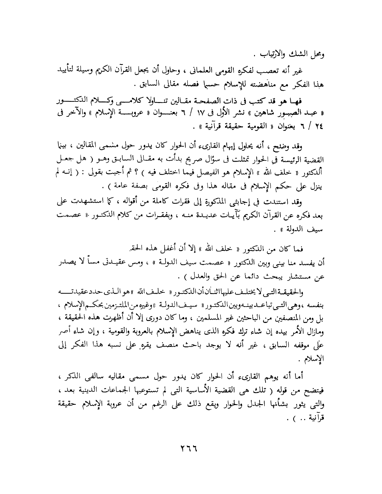 فها هو قد كتب في ذات الصفحة مقالين تناولا كلامي وكلام الدكتور (عبد الصبور شاهين) نشر الأول في 17/ 6 بعنوان " عروبة الإسلام " والآخر في 24/ 6 بعنوان " القومية حقيقة قرآنية ".
