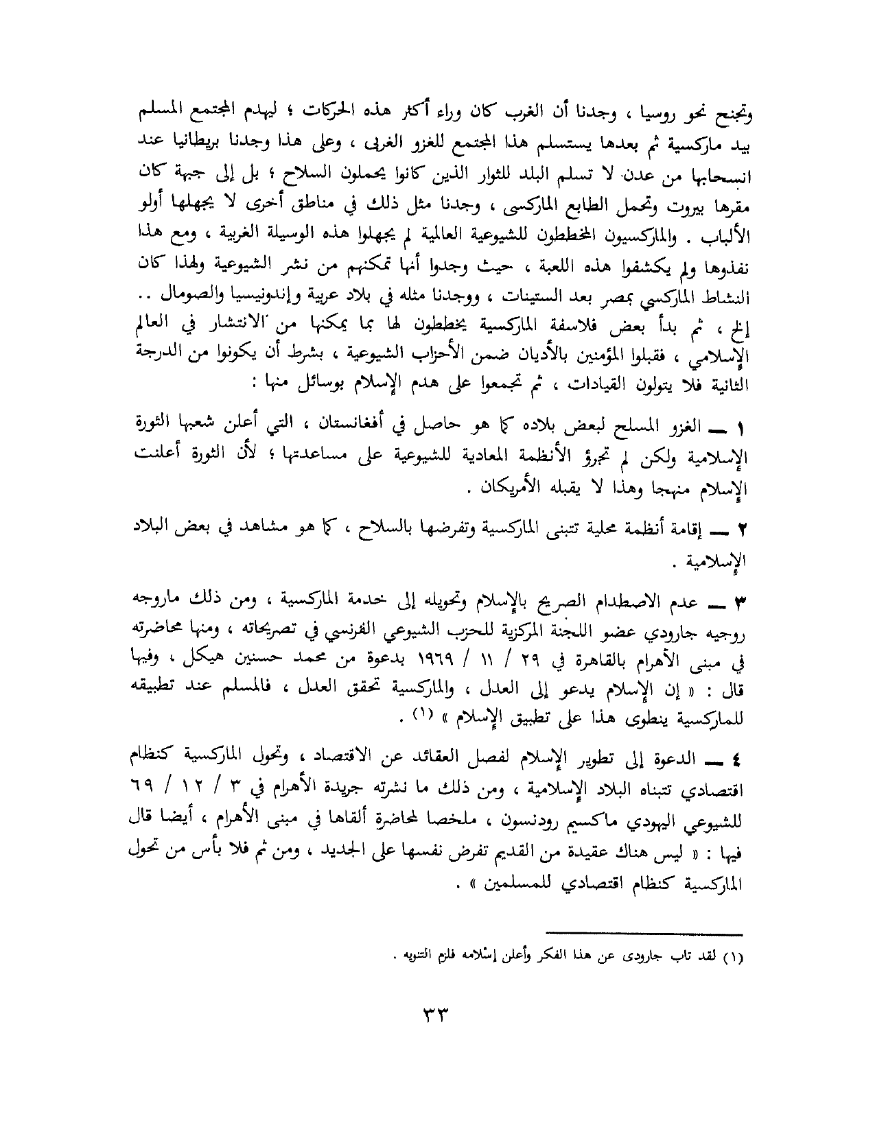 وتجنح نحو روسيا، وجدنا أن الغرب كان وراء أكثر هذه الحركات، ليهدم المجتمع المسلم بيد ماركسية ثم بعدها يستسلم هذا المجتمع للغزو الغربي، وعلى هذا وجدنا بريطانيا عند انسحابها من عدن لا تسلم البلد للثوار الذين كانوا يحملون السلاح؛ بل إلى جبهة كان مقرها بيروت وتحمل الطابع الماركسي، وجدنا مثل ذلك في مناطق أخرى لا يجهلها أولو الألباب. والماركسيون المخططون للشيوعية العالمية لم يجهلوا هذه الوسيلة الغربية، ومع هذا نفذوها ولم يكشفوا هذه اللعبة، حيث وجدوا أنها تمكنهم من نشر الشيوعية ولهذا كان النشاط الماركسي بمصر بعد الستينات، ووجدنا مثله في بلاد عربية وأندونيسيا والصومال .. الخ، ثم بدأ بعض فلاسفة الماركسية يخططون لها بما يمكنها من الانتشار في العالم الإسلامي، فقبلوا المؤمنين بالأديان ضمن الأحزاب الشيوعية، بشرط أن يكونوا من الدرجة الثانية فلا يتولون القيادات، ثم تجمعوا على هدم الإسلام بوسائل منها: