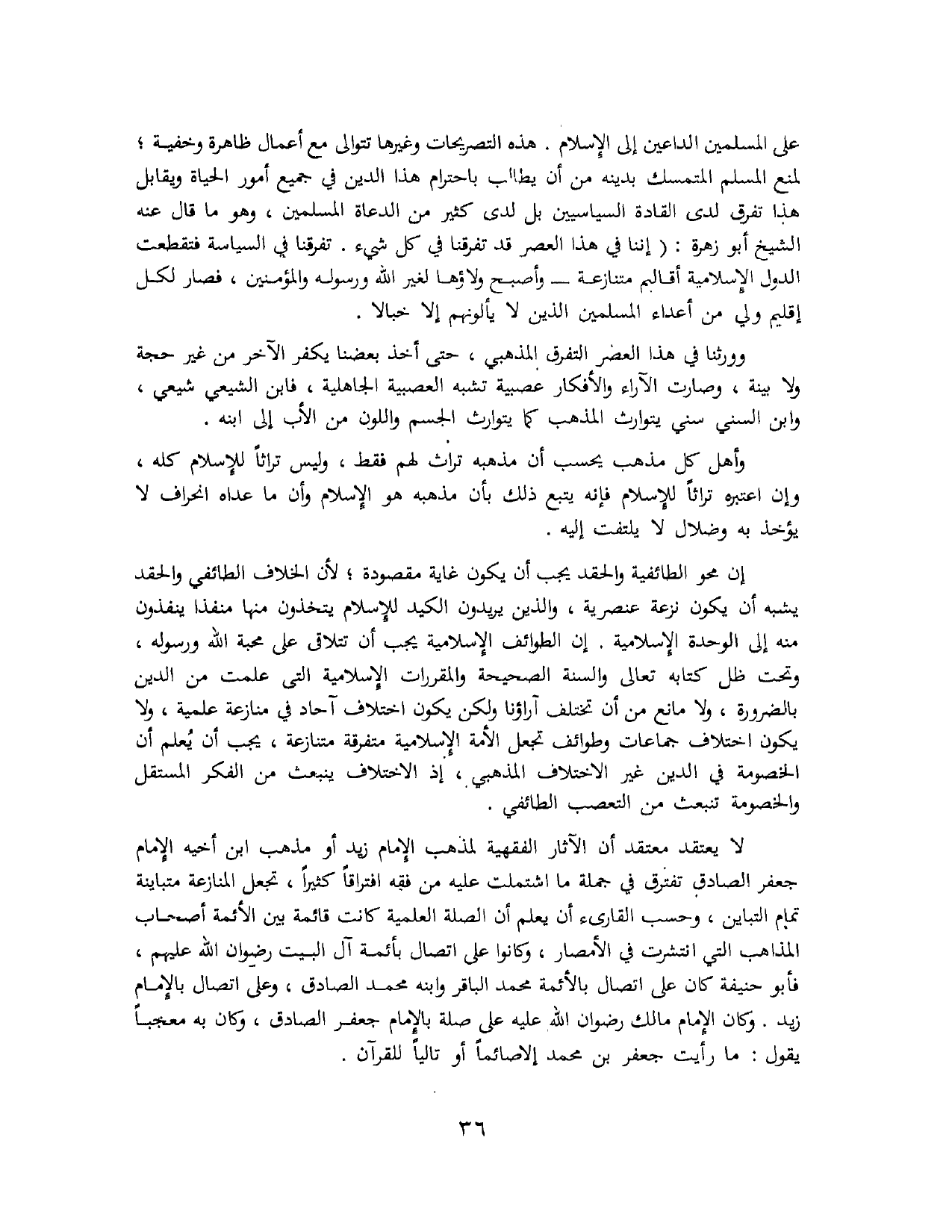 على المسلمين الداعين إلى الإسلام. هذه التصريحات وغيرها تتوالى مع أعمال ظاهرة وخفية، لمنع المسلم المتمسك بدينه من أن يطالب باحترام هذا الدين في جميع أمور الحياة ويقابل هذا تفرق لدى القادة السياسيين بل لدى كثير من الدعاة المسلمين، وهو ما قال عنه الشيخ أبو زهرة: «إِنَّنَا فِي هَذَا العَصْرِ قَدْ تَفَرَّقْنَا فِي كُلِّ شَيْءٍ. تَفَرَّقْنَا فِي السِّياسَةِ فَتَقَطَّعَتْ الدُّوَلُ الإِسْلاَمِيَّةُ أَقَالِيمَ مُتَنَازِعَةً وَأَصْبَحَ وَلاَؤُهَا لِغَيْرِ اللهِ وَرَسُولِهِ وَالمُؤْمِنِينَ، فَصَارَ لَكُلِّ إِقْلِيمٍ وَلِيٌّ مِنْ أَعْدَاءِ المُسْلِمِينَ الذِينَ لاَ يَأْلُونَهُمْ إلاَّ خَبَالاً. وَوَرِثْنَا فِي هَذَا العَصْرِ التَّفَرُّقَ المَذْهَبِيِّ، حَتَّى أَخَذَ بَعْضُنَا يُكَفِّرُ الآخَرَ مِنْ غَيْرِ حُجَّةٍ وَلاَ بَيِّنَةٍ، وَصَارَتْ الآرَاءُ وَالأَفْكَارُ عَصَبِيَّةً تُشْبِهُ العَصَبِيَّةَ الجَاهِلِيَّةَ، فَابْنُ الشِّيَعِيِّ شِيعِيٌّ، وَابْنُ السُّنِّيِّ سُنِّيٌّ يَتَوَارَثُ المَذْهَبَ كَمَا يَتَوَارَثُ الجِسْمُ اللَّوْنَ مِنَ الأَبِ إِلَى ابْنِهِ. وَأَهْلُ كُلِّ مَذْهَبٍ يَحْسَبُ أَنَّ مَذْهَبَهُ تُرَاثٌ لَهُمْ فَقَطْ، وَلَيْسَ تُرَاثًا لِلإِسْلاَمِ كُلَّهُ، وَإِنْ اعْتَبَرَهُ تُرَاثًا لِلإِسْلاَمِ فَإِنَّه يَتْبَعُ ذَلِكَ بِأَنَّ مَذْهَبَهُ هُوَ الإِسْلاَمُ وَأَنَّ مَا عَدَاهُ اِنْحِرَافٌ لاَ يُؤْخَذُ بِهِ وَضَلاَلٌ لاَ يُلْتَفَتُ إِلَيْهِ. إِنَّ مَحْوَ الطَّائِفِيَّةَ وَالحِقْدَ يَجِبُ أَنْ يَكُونَ غَايَةً مَقْصُودَةً؛ لأَنَّ الخِلاَفَ الطَّائِفِيَّ وَالحِقْدَ يُشْبِهُ أَنْ يَكُونَ نَزْعَةً عُنْصُرِيَّةً، وَالذِينَ يُرِيدُونَ الكَيْدَ لِلإِسْلاَمِ يَتَّخِذُونَ مِنْهَا مَنْفَذًا يَنْفِذُونَ مِنْهُ إِلَى الوَحْدَةِ الإِسْلاَمِيَّةِ. إِنَّ الطَّوَائِفَ الإِسْلاَمِيَّةَ يَجِبُ أَنْ تَتَلاَقَى عَلَى مَحَبَّةِ اللهِ وَرَسُولِهِ، وَتَحْتَ ظَلِّ كِتَابِهِ تَعَالَى وَالسُّنَّةِ الصَّحِيحَةِ وَالمُقَرَّارَاتِ الإِسْلاَمِيَّةِ التِي عُلِمَتْ مِنَ الدِّينِ بِالضَّرُورَةِ، وَلاَ مَانِعَ مِنْ أَنْ تَخْتَلِفَ آرَاؤُنَا وَلَكِنْ يَكُونُ اخْتِلاَفَ آحَادٍ فِي مُنَازَعَةٍ عِلْمِيَّةٍ، وَلاَ يَكُونُ اخْتِلاَفَ جَمَاعَاتٍ وَطَوَائِفَ تَجْعَلُ الأُمَّةَ الإِسْلاَمِيَّةَ مُتَفَرِّقَةً مُتَنَازِعَةً، يَجِبُ أَنْ يُعْلَمَ أَنَّ الخُصُومَةَ فِي الدِّينِ غَيْرَ الاِخْتِلاَفَ الفِقْهِيّ، إِذْ الاِخْتِلاَفُ يَنْبَعِثُ مِنَ الفِكْرِ المُسْتَقِلِّ وَالخُصُومَةُ تَنْبَعِثُ مِنَ التَّعَصُّبِ الطَّائِفِيِّ. لاَ يُعْتَقَدُ أَنَّ الآثارَ الفِقْهِيَّةَ لِمَذْهَبِ الإِمَامِ زَيْدٍ أَوْ مَذْهَبَ ابْنِ أَخِيهِ الإِمَامَ جَعْفَرَ الصَّادِقَ تَفْتَرِقُ فِي جُمَلَةِ مَا اشْتَمَلَتْ عَلَيْهِ مِنْ فِقْهٍ اِفْتِرَاقًا كَثِيرًا، تَجْعَلُ المُنَازَعَةَ مُتَبَايِنَةً تَمَامَ التَّبَايُنِ، وَحَسَبَ القَارِئَ أَنْ يَعْلَمَ أَنَّ الصِّلَةَ العِلْمِيَّةَ كَانَتْ قَائِمَةً بَيْنَ الأَئِمَّةِ أَصْحَابَ المَذَاهِبِ التِي انْتَشَرَتْ فِي الأَمْصَارِ، وَكَانُوا عَلَى اِتِّصَالٍ بِأَئِمَّةِ آلِ البَيْتَ - رِضْوَانُ اللهِ عَلَيْهِمْ -، فَأَبُو حَنِيفَةَ كَانَ عَلَى اتِّصَالٍ بِالأَئِمَّةِ مُحَمَّدَ البَاقِرَ وَابْنَهُ مُحَمَّدَ الصَّادِقَ، وَعَلَى اتِّصَالٍ بِالإِمَامِ زَيْدٍ. وَكَانَ الإِمَامُ مَالِكٍ - رِضْوَانُ اللهِ عَلَيْهِ - عَلَى صِلَةٍ بِالإِمَامِ جَعْفَرَ الصَّادِقَ، وَكَانَ بِهِ مُعْجَبًا يَقُولُ: " مَا رَأَيْتُ جَعْفَرَ بْنَ مُحَمَّدٍ إِلاَّ صَائِمًا أَوْ تَالِيًا لِلْقُرْآنِ ".