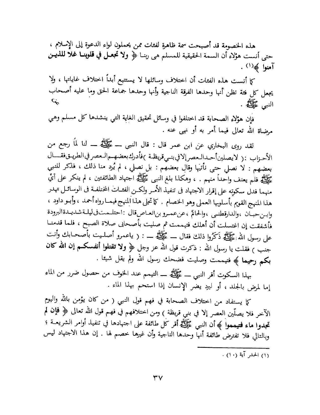 لَقَدْ رَوَى البُخَارِيُّ عَنْ ابْنِ عُمَرَ قَالَ: «قَالَ النَّبِيُّ - صَلَّى اللهُ عَلَيْهِ وَسَلَّمَ - لَنَا لَمَّا رَجَعَ مِنَ الأَحْزَابِ: " لاَ يُصَلِّيَنَّ أَحَدٌ العَصْرَ إِلاَّ فِي بَنِي قُرَيْظَةَ " فَأَدْرَكَ بَعْضَهُمُ العَصْرُ فِي الطَّرِيقِ، فَقَالَ بَعْضُهُمْ: لاَ نُصَلِّي حَتَّى نَأْتِيَهَا، وَقَالَ بَعْضُهُمْ: بَلْ نُصَلِّي، لَمْ يُرَدْ مِنَّا ذَلِكَ، فَذُكِرَ لِلنَّبِيِّ - صَلَّى اللهُ عَلَيْهِ وَسَلَّمَ -، فَلَمْ يُعَنِّفْ وَاحِدًا مِنْهُمْ». وَهَكَذَا بَلَغَ النَّبِيَّ - صَلَّى اللهُ عَلَيْهِ وَسَلَّمَ - اجْتِهَادَ الطَّائِفَتَيْنِ، لَمْ يُنْكِرْ عَلَى أَيٍّ مِنْهُمَا، فَدَلَّ سُكُوتُهُ عَلَى إِقْرَارِ الاِجْتِهَادِ فِي تَنْفِيذِ الأَمْرِ، وَلَكِنَّ الفِئَاتَ المُخْتَلِفَةَ فِي الوَسَائِلِ تَهْدُرُ هَذَا المَنْهَجَ القَوِيمَ بِأُسْلُوبِهَا العَمَلِيِّ وَهُوَ الخِصَامُ. كَمَا تَجَلَّى هَذَا المَنْهَجُ فِيمَا رَوَاهُ أَحْمَدُ، وَأَبُو دَاوُدُ، وْابْنُ حِبَّانَ، وَالدَّارَقُطْنِيُّ، وَالحَاكِمُ، عَنْ عَمْرٍو بْنِ العَاصِ قَالَ: اِحْتَلَمْتُ فِي لَيْلَةٍ شَدِيدَةَ البُرُودَةِ فَأَشْفَقْتُ إنْ اغْتَسَلْتُ أنْ أَهْلَكَ فَتَيَمَّمْتُ ثُمَّ صَلَّيْتُ بِأَصْحَابِي صَلاَةَ الصُّبْحِ، فَلَمَّا قَدِمْنَا عَلَى رَسُولِ اللهِ ذَكَرُوا ذَلِكَ، فَقَالَ - صَلَّى اللهُ عَلَيْهِ وَسَلَّمَ -: «يَا عَمْرُو صَلَّيْتَ بِأَصْحَابِكَ وَأَنْتَ جُنُبٌ؟». فَقُلْتُ: يَا رَسُولَ اللهِ ذَكَرْتُ قَوْلَ اللهِ عَزَّ وَجَلَّ {وَلاَ تَقْتُلُوا أَنْفُسَكُمْ إِنَّ اللَّهَ كَانَ بِكُمْ رَحِيمًا} [النساء: 29]، فَتَيَمَّمْتُ وَصَلَّيْتُ. فَضَحِكَ رَسُولُ اللهِ وَلَمْ يَقُلْ شَيْئًا.